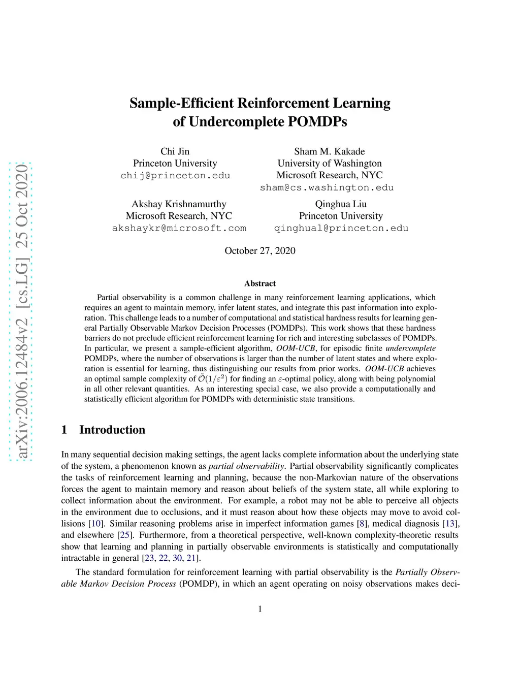 Partial observability is a common challenge in many reinforcement learning applications, which requires an agent to maintain memory, infer latent states, and integrate this past information into exploration. This challenge leads to a number of computational and statistical hardness results for learning general Partially Observable Markov Decision Processes (POMDPs). This work shows that these hardness barriers do not preclude efficient reinforcement learning for rich and interesting subclasses of POMDPs. In particular, we present a sample-efficient algorithm, OOM-UCB, for episodic finite undercomplete POMDPs, where the number of observations is larger than the number of latent states and where exploration is essential for learning, thus distinguishing our results from prior works. OOM-UCB achieves an optimal sample complexity of for finding an -optimal policy, along with being polynomial in all other relevant quantities. As an interesting special case, we also provide a computationally and statistically efficient algorithm for POMDPs with deterministic state transitions.