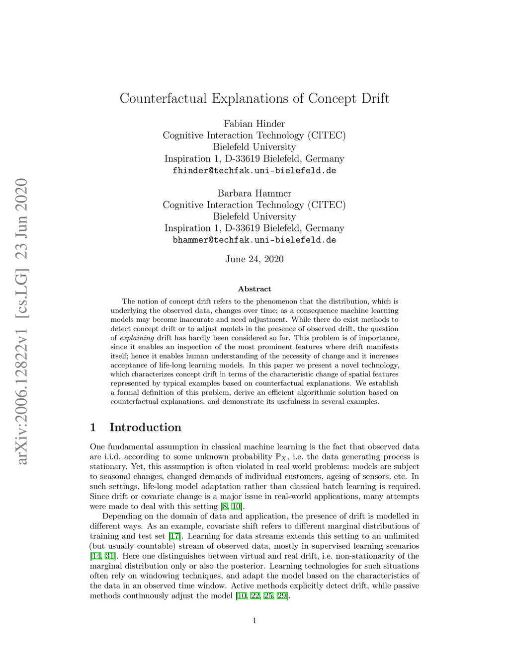 The notion of concept drift refers to the phenomenon that the distribution, which is underlying the observed data, changes over time; as a consequence machine learning models may become inaccurate and need adjustment. While there do exist methods to detect concept drift or to adjust models in the presence of observed drift, the question of explaining drift has hardly been considered so far. This problem is of importance, since it enables an inspection of the most prominent features where drift manifests itself; hence it enables human understanding of the necessity of change and it increases acceptance of life-long learning models. In this paper we present a novel technology, which characterizes concept drift in terms of the characteristic change of spatial features represented by typical examples based on counterfactual explanations. We establish a formal definition of this problem, derive an efficient algorithmic solution based on counterfactual explanations, and demonstrate its usefulness in several examples.