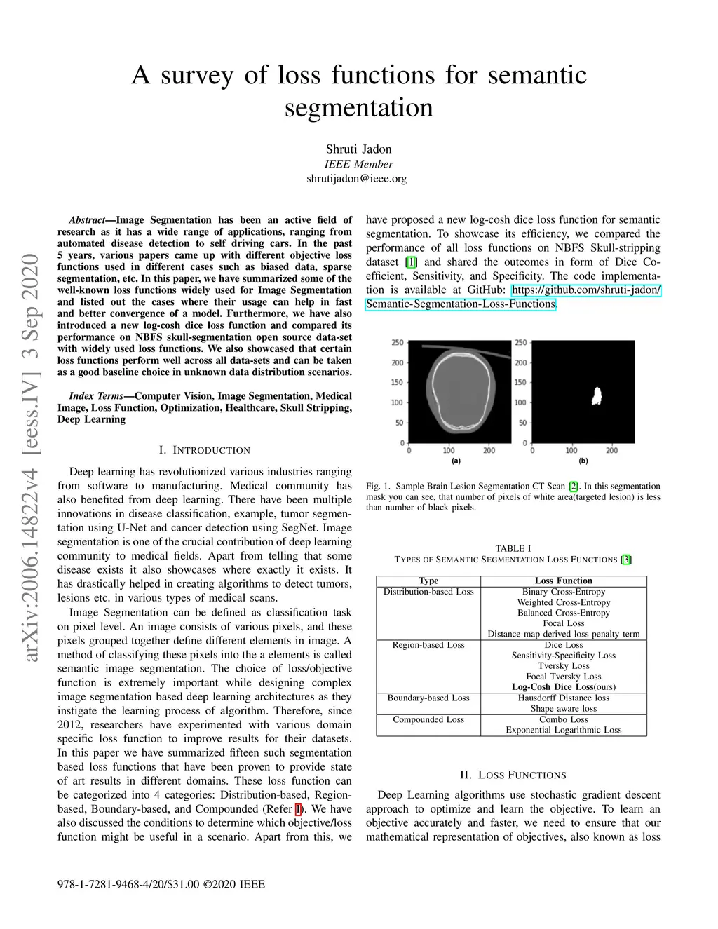 Image Segmentation has been an active field of research as it has a wide range of applications, ranging from automated disease detection to self-driving cars. In the past five years, various papers came up with different objective loss functions used in different cases such as biased data, sparse segmentation, etc. In this paper, we have summarized some of the well-known loss functions widely used for Image Segmentation and listed out the cases where their usage can help in fast and better convergence of a model. Furthermore, we have also introduced a new log-cosh dice loss function and compared its performance on the NBFS skull-segmentation open-source data-set with widely used loss functions. We also showcased that certain loss functions perform well across all data-sets and can be taken as a good baseline choice in unknown data distribution scenarios. Our code is available at Github: https://github.com/shruti-jadon/Semantic-Segmentation-Loss-Functions.