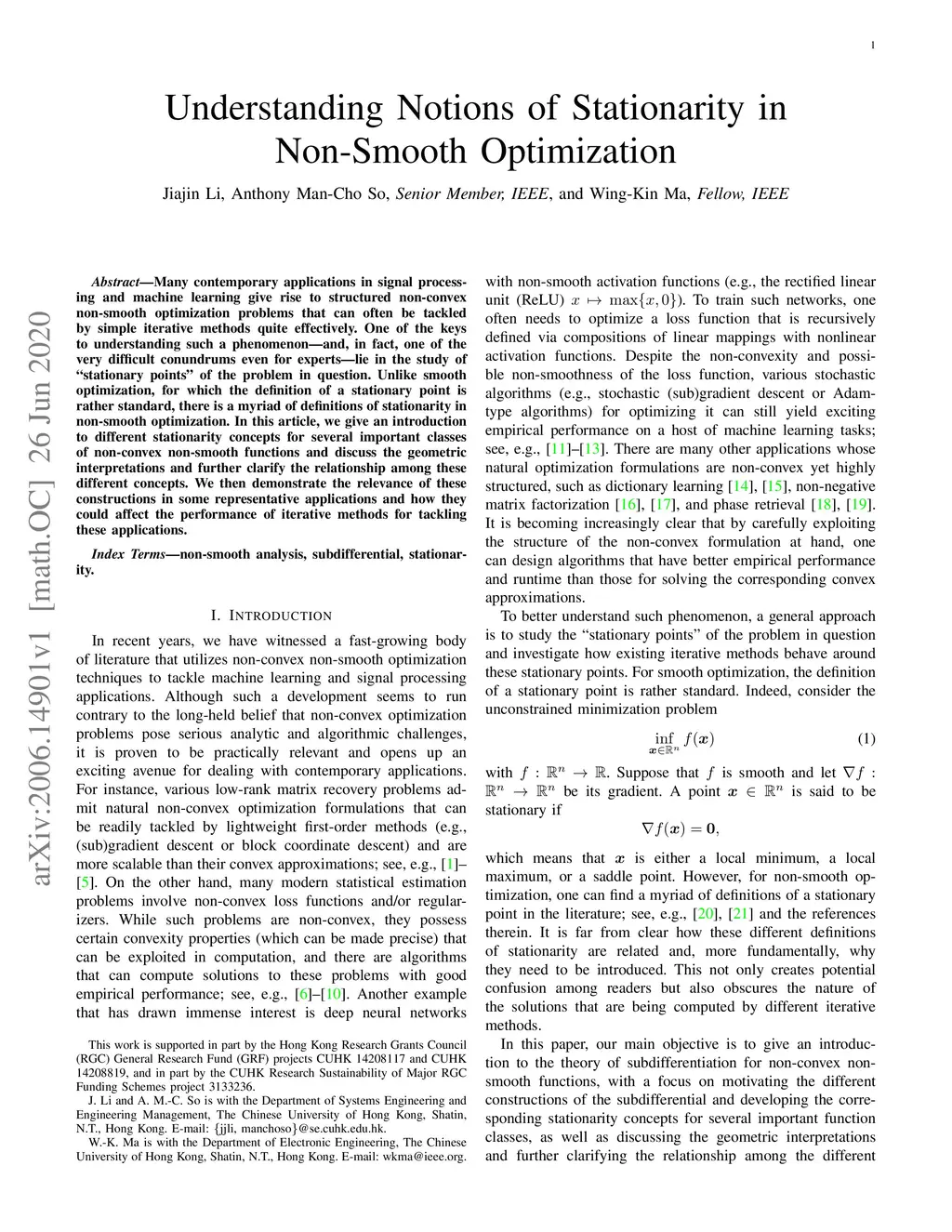 Many contemporary applications in signal processing and machine learning give rise to structured non-convex non-smooth optimization problems that can often be tackled by simple iterative methods quite effectively. One of the keys to understanding such a phenomenon---and, in fact, one of the very difficult conundrums even for experts---lie in the study of "stationary points" of the problem in question. Unlike smooth optimization, for which the definition of a stationary point is rather standard, there is a myriad of definitions of stationarity in non-smooth optimization. In this article, we give an introduction to different stationarity concepts for several important classes of non-convex non-smooth functions and discuss the geometric interpretations and further clarify the relationship among these different concepts. We then demonstrate the relevance of these constructions in some representative applications and how they could affect the performance of iterative methods for tackling these applications.