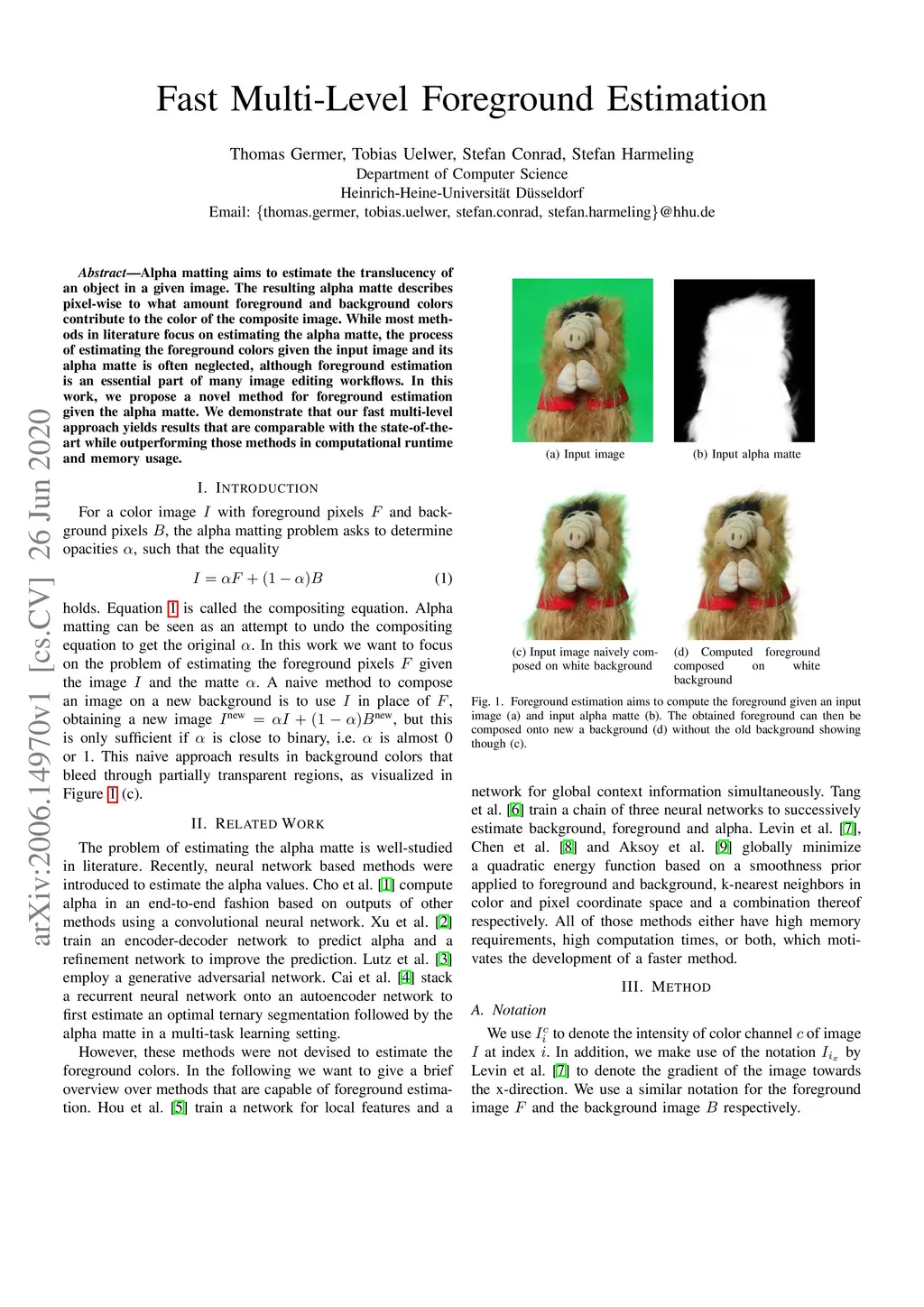 Alpha matting aims to estimate the translucency of an object in a given image. The resulting alpha matte describes pixel-wise to what amount foreground and background colors contribute to the color of the composite image. While most methods in literature focus on estimating the alpha matte, the process of estimating the foreground colors given the input image and its alpha matte is often neglected, although foreground estimation is an essential part of many image editing workflows. In this work, we propose a novel method for foreground estimation given the alpha matte. We demonstrate that our fast multi-level approach yields results that are comparable with the state-of-the-art while outperforming those methods in computational runtime and memory usage.