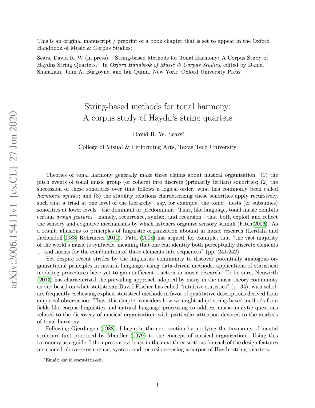 This chapter considers how string-based methods might be adapted to address music-analytic questions related to the discovery of musical organization, with particular attention devoted to the analysis of tonal harmony. I begin by applying the taxonomy of mental organization proposed by Mandler (1979) to the concept of musical organization. Using this taxonomy as a guide, I then present evidence for three principles of tonal harmony -- recurrence, syntax, and recursion -- using a corpus of Haydn string quartets.