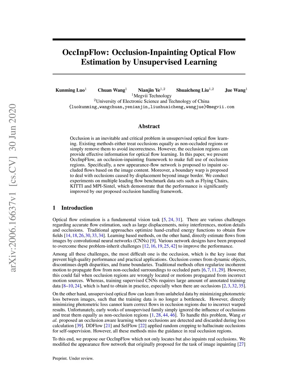 OccInpFlow: Occlusion-Inpainting Optical Flow Estimation by Unsupervised