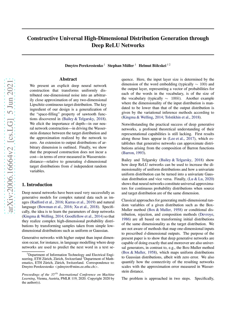 We present an explicit deep neural network construction that transforms uniformly distributed one-dimensional noise into an arbitrarily close approximation of any two-dimensional Lipschitz-continuous target distribution. The key ingredient of our design is a generalization of the "space-filling" property of sawtooth functions discovered in (Bailey & Telgarsky, 2018). We elicit the importance of depth - in our neural network construction - in driving the Wasserstein distance between the target distribution and the approximation realized by the network to zero. An extension to output distributions of arbitrary dimension is outlined. Finally, we show that the proposed construction does not incur a cost - in terms of error measured in Wasserstein-distance - relative to generating -dimensional target distributions from independent random variables.