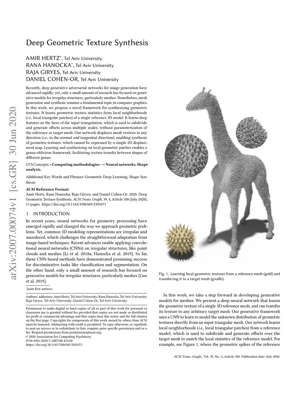 Recently, deep generative adversarial networks for image generation have advanced rapidly; yet, only a small amount of research has focused on generative models for irregular structures, particularly meshes. Nonetheless, mesh generation and synthesis remains a fundamental topic in computer graphics. In this work, we propose a novel framework for synthesizing geometric textures. It learns geometric texture statistics from local neighborhoods (i.e., local triangular patches) of a single reference 3D model. It learns deep features on the faces of the input triangulation, which is used to subdivide and generate offsets across multiple scales, without parameterization of the reference or target mesh. Our network displaces mesh vertices in any direction (i.e., in the normal and tangential direction), enabling synthesis of geometric textures, which cannot be expressed by a simple 2D displacement map. Learning and synthesizing on local geometric patches enables a genus-oblivious framework, facilitating texture transfer between shapes of different genus.