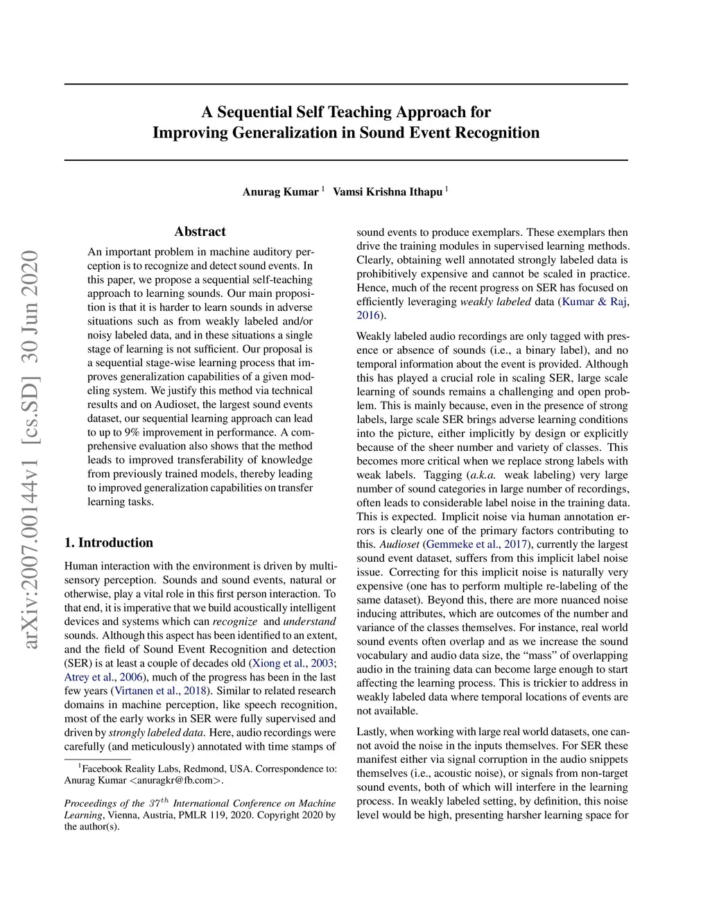 An important problem in machine auditory perception is to recognize and detect sound events. In this paper, we propose a sequential self-teaching approach to learning sounds. Our main proposition is that it is harder to learn sounds in adverse situations such as from weakly labeled and/or noisy labeled data, and in these situations a single stage of learning is not sufficient. Our proposal is a sequential stage-wise learning process that improves generalization capabilities of a given modeling system. We justify this method via technical results and on Audioset, the largest sound events dataset, our sequential learning approach can lead to up to 9% improvement in performance. A comprehensive evaluation also shows that the method leads to improved transferability of knowledge from previously trained models, thereby leading to improved generalization capabilities on transfer learning tasks.