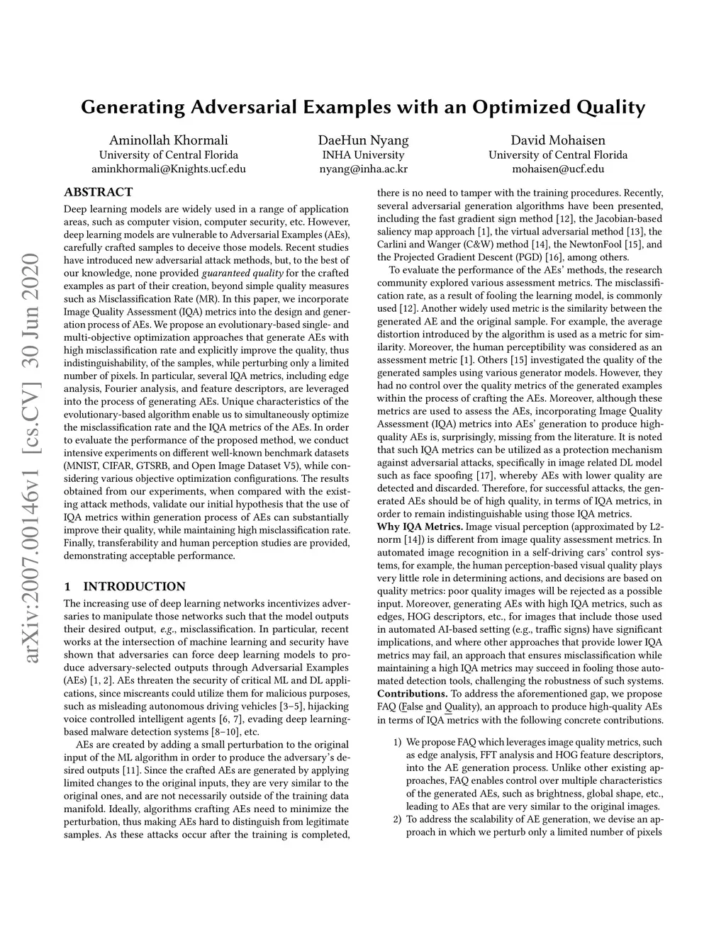 Generating Adversarial Examples with an Optimized Quality