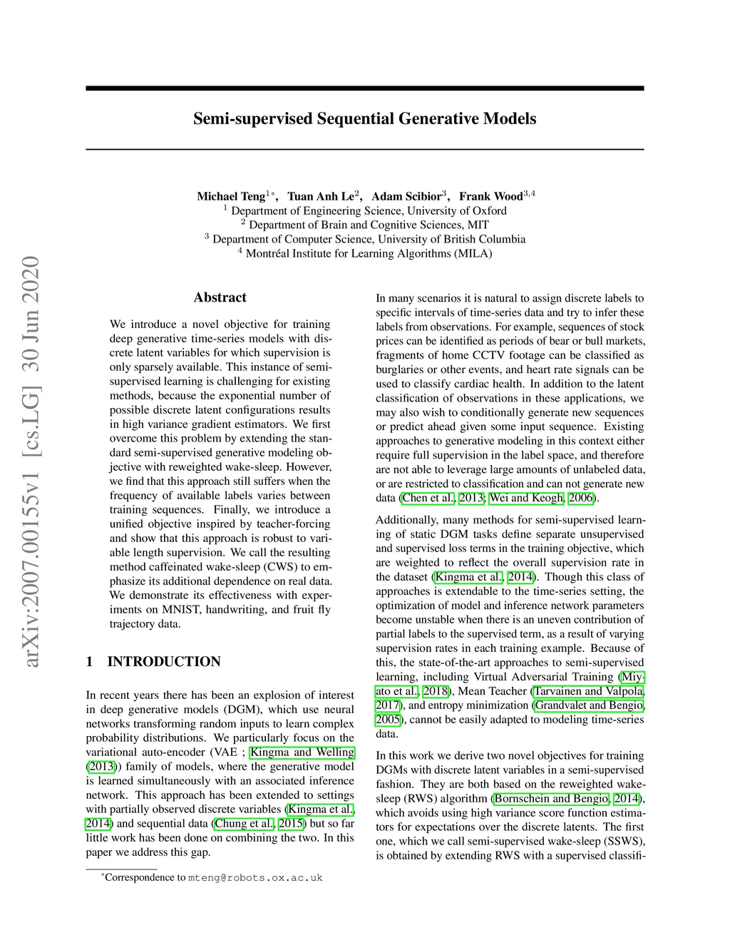 We introduce a novel objective for training deep generative time-series models with discrete latent variables for which supervision is only sparsely available. This instance of semi-supervised learning is challenging for existing methods, because the exponential number of possible discrete latent configurations results in high variance gradient estimators. We first overcome this problem by extending the standard semi-supervised generative modeling objective with reweighted wake-sleep. However, we find that this approach still suffers when the frequency of available labels varies between training sequences. Finally, we introduce a unified objective inspired by teacher-forcing and show that this approach is robust to variable length supervision. We call the resulting method caffeinated wake-sleep (CWS) to emphasize its additional dependence on real data. We demonstrate its effectiveness with experiments on MNIST, handwriting, and fruit fly trajectory data.
