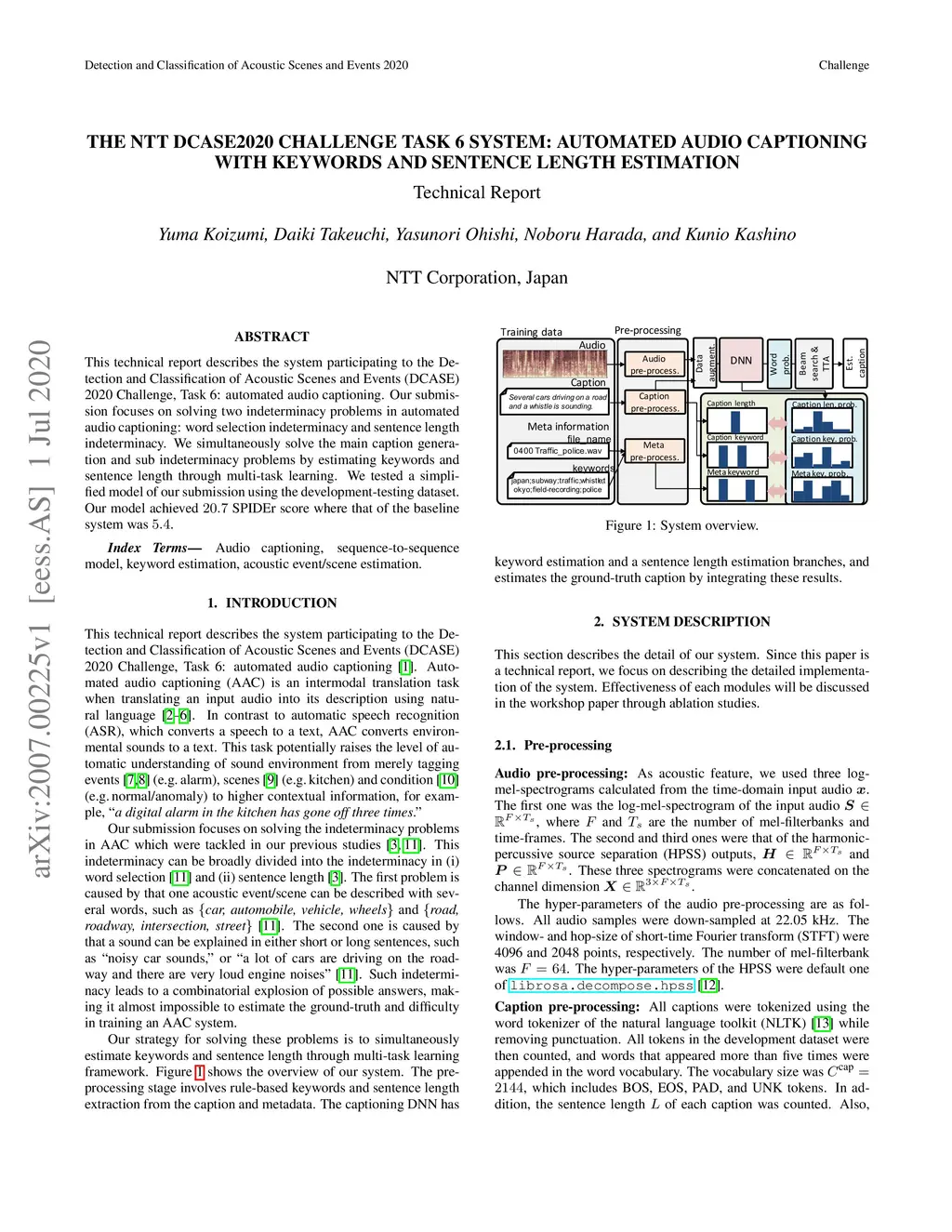 This technical report describes the system participating to the Detection and Classification of Acoustic Scenes and Events (DCASE) 2020 Challenge, Task 6: automated audio captioning. Our submission focuses on solving two indeterminacy problems in automated audio captioning: word selection indeterminacy and sentence length indeterminacy. We simultaneously solve the main caption generation and sub indeterminacy problems by estimating keywords and sentence length through multi-task learning. We tested a simplified model of our submission using the development-testing dataset. Our model achieved 20.7 SPIDEr score where that of the baseline system was 5.4.