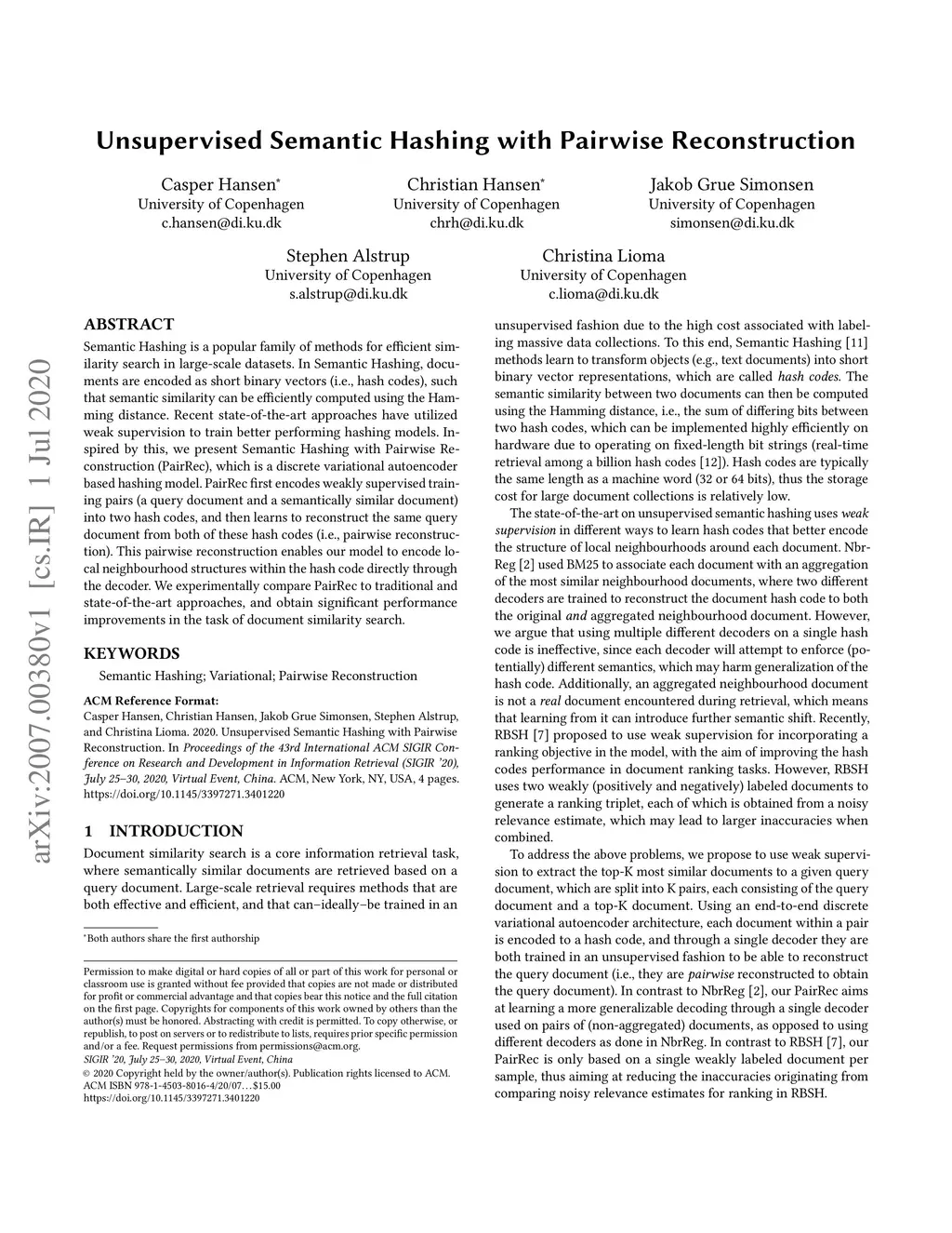 Unsupervised Semantic Hashing with Pairwise Reconstruction
