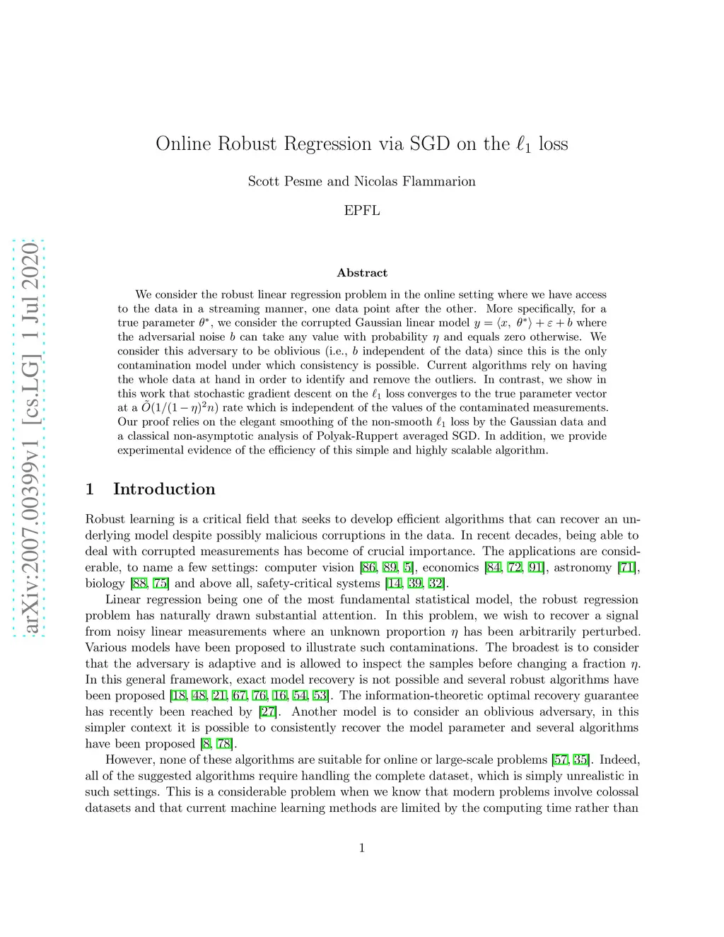 We consider the robust linear regression problem in the online setting where we have access to the data in a streaming manner, one data point after the other. More specifically, for a true parameter , we consider the corrupted Gaussian linear model where the adversarial noise can take any value with probability and equals zero otherwise. We consider this adversary to be oblivious (i.e., independent of the data) since this is the only contamination model under which consistency is possible. Current algorithms rely on having the whole data at hand in order to identify and remove the outliers. In contrast, we show in this work that stochastic gradient descent on the loss converges to the true parameter vector at a rate which is independent of the values of the contaminated measurements. Our proof relies on the elegant smoothing of the non-smooth loss by the Gaussian data and a classical non-asymptotic analysis of Polyak-Ruppert averaged SGD. In addition, we provide experimental evidence of the efficiency of this simple and highly scalable algorithm.