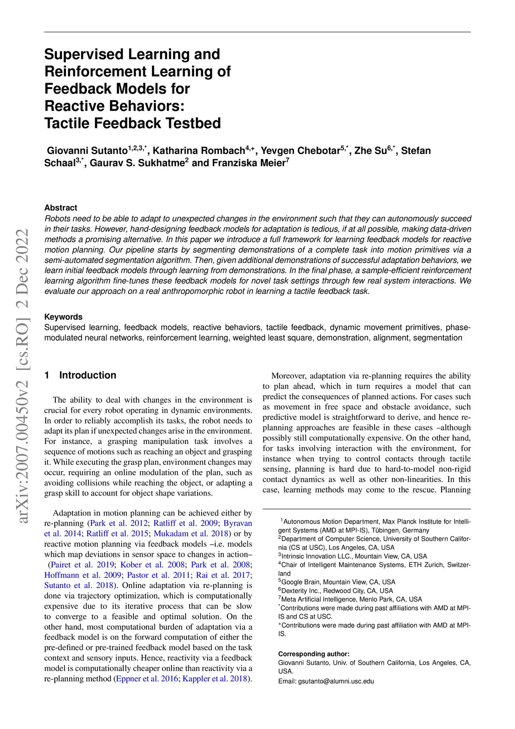 Robots need to be able to adapt to unexpected changes in the environment such that they can autonomously succeed in their tasks. However, hand-designing feedback models for adaptation is tedious, if at all possible, making data-driven methods a promising alternative. In this paper we introduce a full framework for learning feedback models for reactive motion planning. Our pipeline starts by segmenting demonstrations of a complete task into motion primitives via a semi-automated segmentation algorithm. Then, given additional demonstrations of successful adaptation behaviors, we learn initial feedback models through learning from demonstrations. In the final phase, a sample-efficient reinforcement learning algorithm fine-tunes these feedback models for novel task settings through few real system interactions. We evaluate our approach on a real anthropomorphic robot in learning a tactile feedback task.