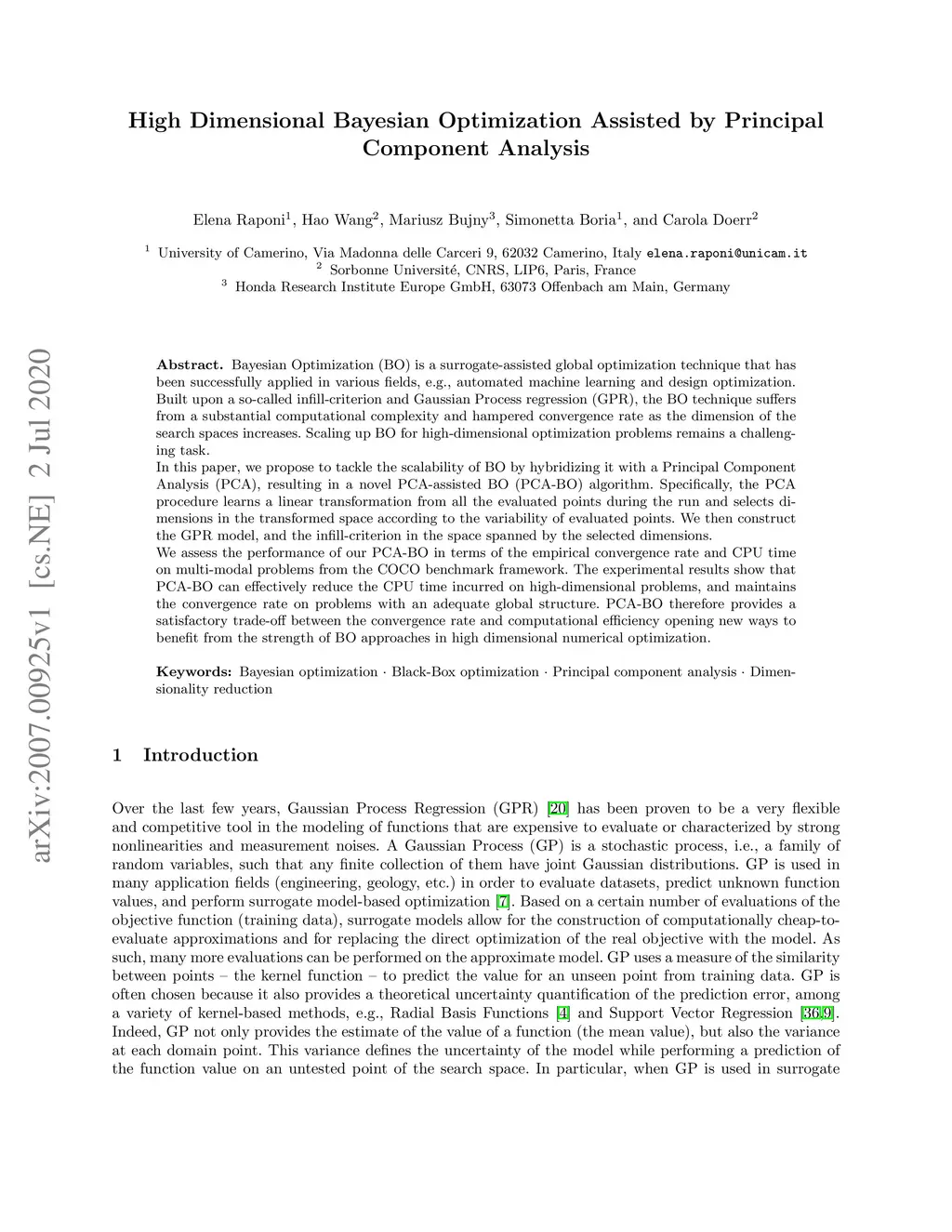 High Dimensional Bayesian Optimization Assisted by Principal Component