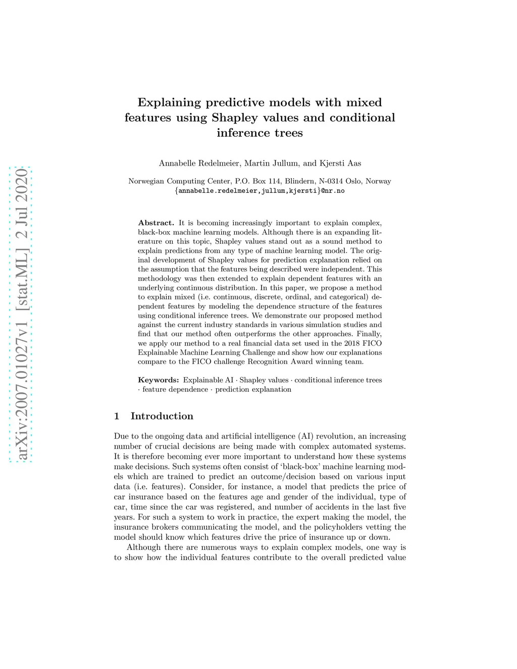 It is becoming increasingly important to explain complex, black-box machine learning models. Although there is an expanding literature on this topic, Shapley values stand out as a sound method to explain predictions from any type of machine learning model. The original development of Shapley values for prediction explanation relied on the assumption that the features being described were independent. This methodology was then extended to explain dependent features with an underlying continuous distribution. In this paper, we propose a method to explain mixed (i.e. continuous, discrete, ordinal, and categorical) dependent features by modeling the dependence structure of the features using conditional inference trees. We demonstrate our proposed method against the current industry standards in various simulation studies and find that our method often outperforms the other approaches. Finally, we apply our method to a real financial data set used in the 2018 FICO Explainable Machine Learning Challenge and show how our explanations compare to the FICO challenge Recognition Award winning team.