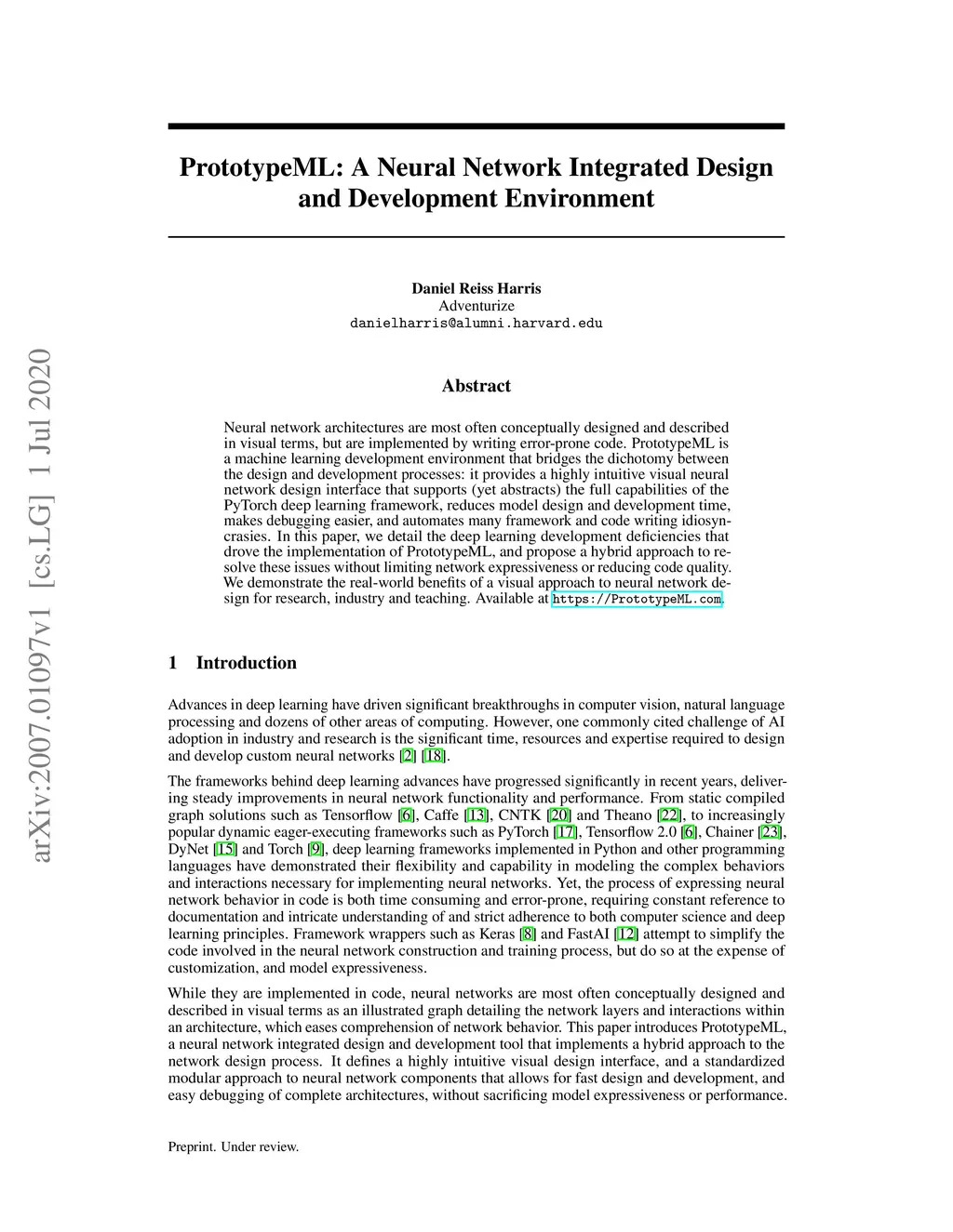 Neural network architectures are most often conceptually designed and described in visual terms, but are implemented by writing error-prone code. PrototypeML is a machine learning development environment that bridges the dichotomy between the design and development processes: it provides a highly intuitive visual neural network design interface that supports (yet abstracts) the full capabilities of the PyTorch deep learning framework, reduces model design and development time, makes debugging easier, and automates many framework and code writing idiosyncrasies. In this paper, we detail the deep learning development deficiencies that drove the implementation of PrototypeML, and propose a hybrid approach to resolve these issues without limiting network expressiveness or reducing code quality. We demonstrate the real-world benefits of a visual approach to neural network design for research, industry and teaching. Available at https://PrototypeML.com
