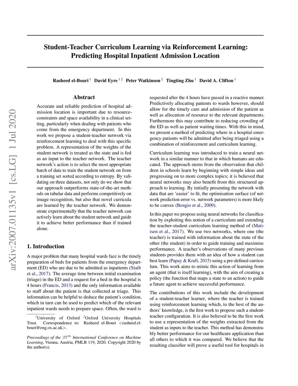 Accurate and reliable prediction of hospital admission location is important due to resource-constraints and space availability in a clinical setting, particularly when dealing with patients who come from the emergency department. In this work we propose a student-teacher network via reinforcement learning to deal with this specific problem. A representation of the weights of the student network is treated as the state and is fed as an input to the teacher network. The teacher network's action is to select the most appropriate batch of data to train the student network on from a training set sorted according to entropy. By validating on three datasets, not only do we show that our approach outperforms state-of-the-art methods on tabular data and performs competitively on image recognition, but also that novel curricula are learned by the teacher network. We demonstrate experimentally that the teacher network can actively learn about the student network and guide it to achieve better performance than if trained alone.