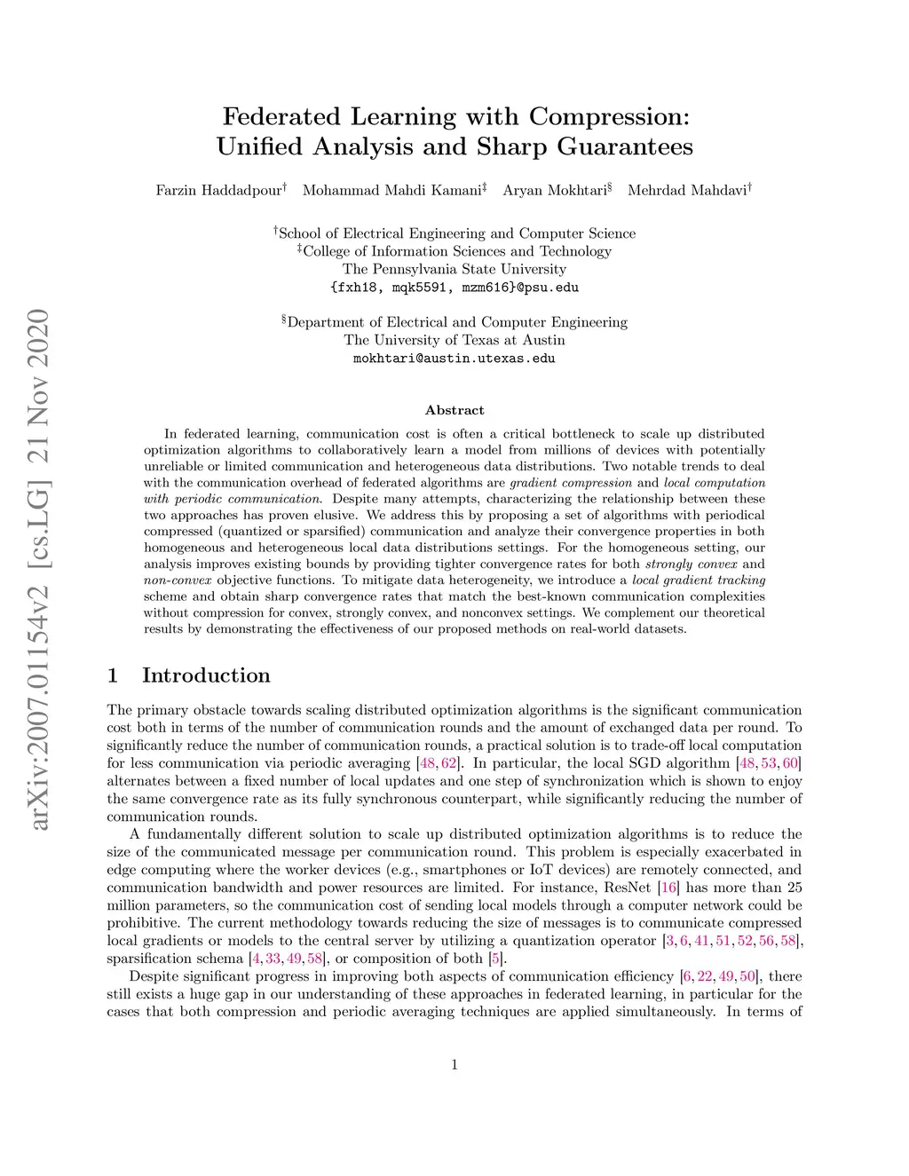 In federated learning, communication cost is often a critical bottleneck to scale up distributed optimization algorithms to collaboratively learn a model from millions of devices with potentially unreliable or limited communication and heterogeneous data distributions. Two notable trends to deal with the communication overhead of federated algorithms are gradient compression and local computation with periodic communication. Despite many attempts, characterizing the relationship between these two approaches has proven elusive. We address this by proposing a set of algorithms with periodical compressed (quantized or sparsified) communication and analyze their convergence properties in both homogeneous and heterogeneous local data distribution settings. For the homogeneous setting, our analysis improves existing bounds by providing tighter convergence rates for both strongly convex and non-convex objective functions. To mitigate data heterogeneity, we introduce a local gradient tracking scheme and obtain sharp convergence rates that match the best-known communication complexities without compression for convex, strongly convex, and nonconvex settings. We complement our theoretical results and demonstrate the effectiveness of our proposed methods by several experiments on real-world datasets.