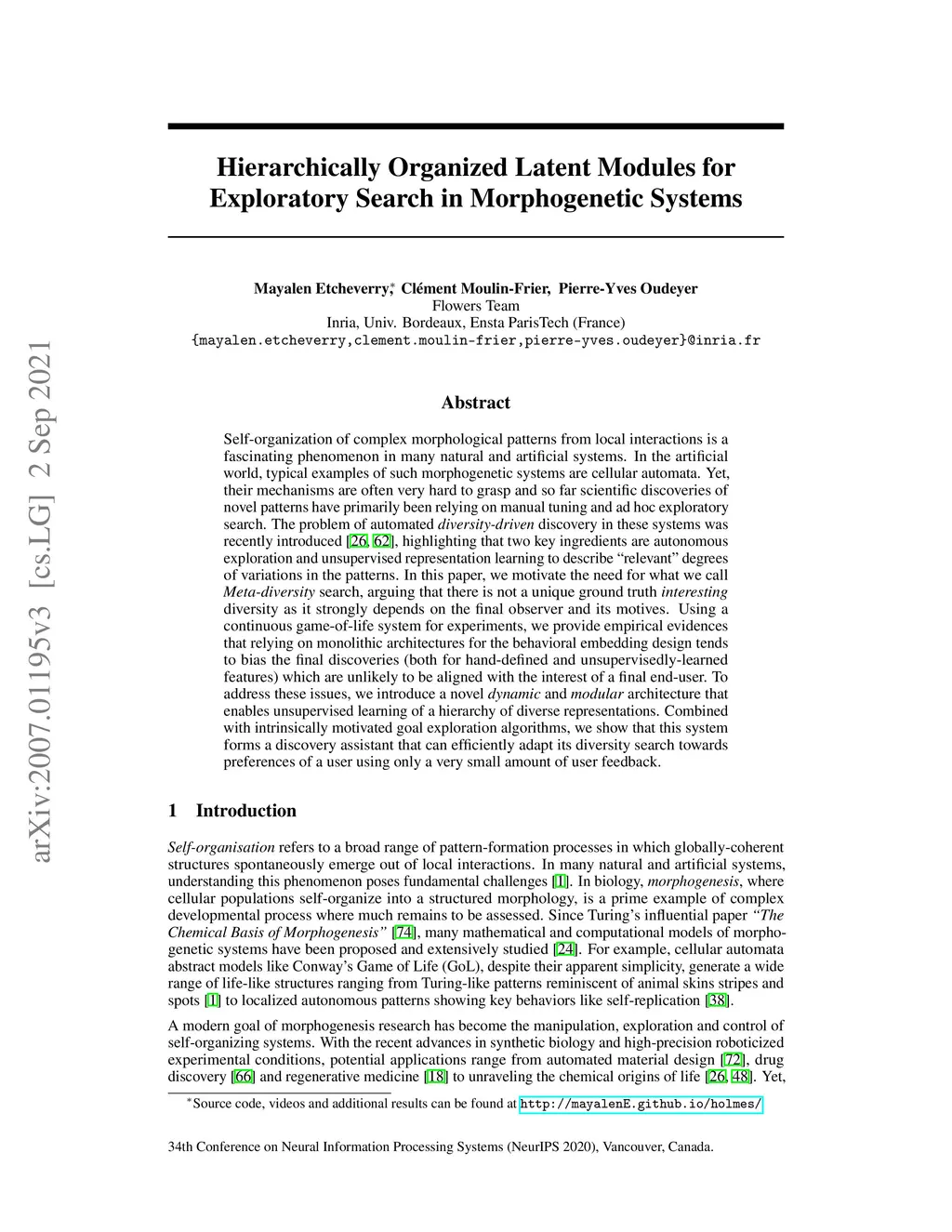 Self-organization of complex morphological patterns from local interactions is a fascinating phenomenon in many natural and artificial systems. In the artificial world, typical examples of such morphogenetic systems are cellular automata. Yet, their mechanisms are often very hard to grasp and so far scientific discoveries of novel patterns have primarily been relying on manual tuning and ad hoc exploratory search. The problem of automated diversity-driven discovery in these systems was recently introduced [26, 62], highlighting that two key ingredients are autonomous exploration and unsupervised representation learning to describe "relevant" degrees of variations in the patterns. In this paper, we motivate the need for what we call Meta-diversity search, arguing that there is not a unique ground truth interesting diversity as it strongly depends on the final observer and its motives. Using a continuous game-of-life system for experiments, we provide empirical evidences that relying on monolithic architectures for the behavioral embedding design tends to bias the final discoveries (both for hand-defined and unsupervisedly-learned features) which are unlikely to be aligned with the interest of a final end-user. To address these issues, we introduce a novel dynamic and modular architecture that enables unsupervised learning of a hierarchy of diverse representations. Combined with intrinsically motivated goal exploration algorithms, we show that this system forms a discovery assistant that can efficiently adapt its diversity search towards preferences of a user using only a very small amount of user feedback.