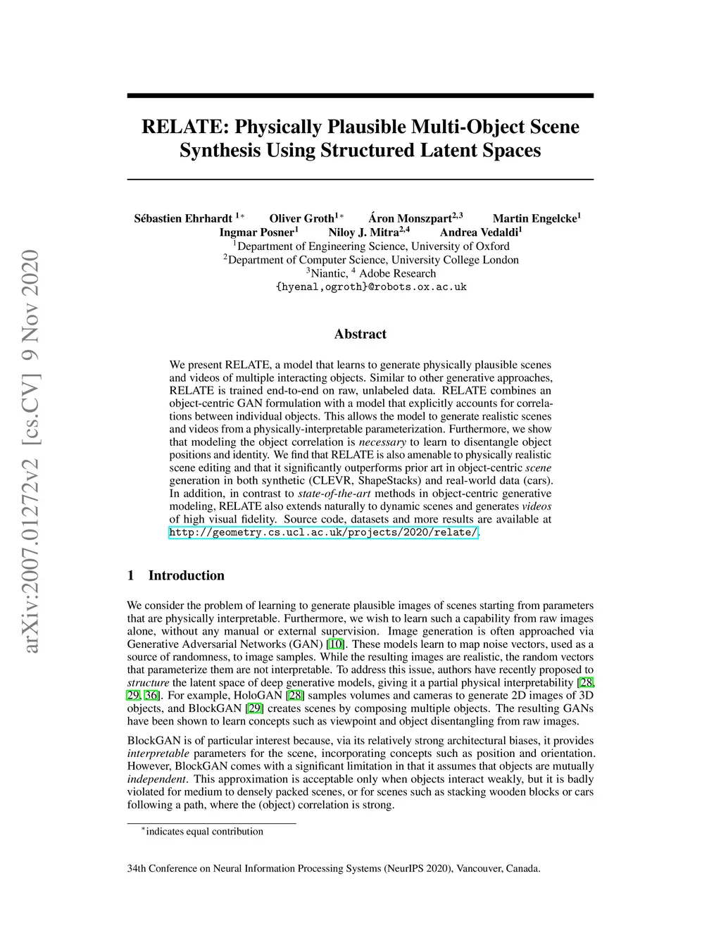 We present RELATE, a model that learns to generate physically plausible scenes and videos of multiple interacting objects. Similar to other generative approaches, RELATE is trained end-to-end on raw, unlabeled data. RELATE combines an object-centric GAN formulation with a model that explicitly accounts for correlations between individual objects. This allows the model to generate realistic scenes and videos from a physically-interpretable parameterization. Furthermore, we show that modeling the object correlation is necessary to learn to disentangle object positions and identity. We find that RELATE is also amenable to physically realistic scene editing and that it significantly outperforms prior art in object-centric scene generation in both synthetic (CLEVR, ShapeStacks) and real-world data (cars). In addition, in contrast to state-of-the-art methods in object-centric generative modeling, RELATE also extends naturally to dynamic scenes and generates videos of high visual fidelity. Source code, datasets and more results are available at http://geometry.cs.ucl.ac.uk/projects/2020/relate/.