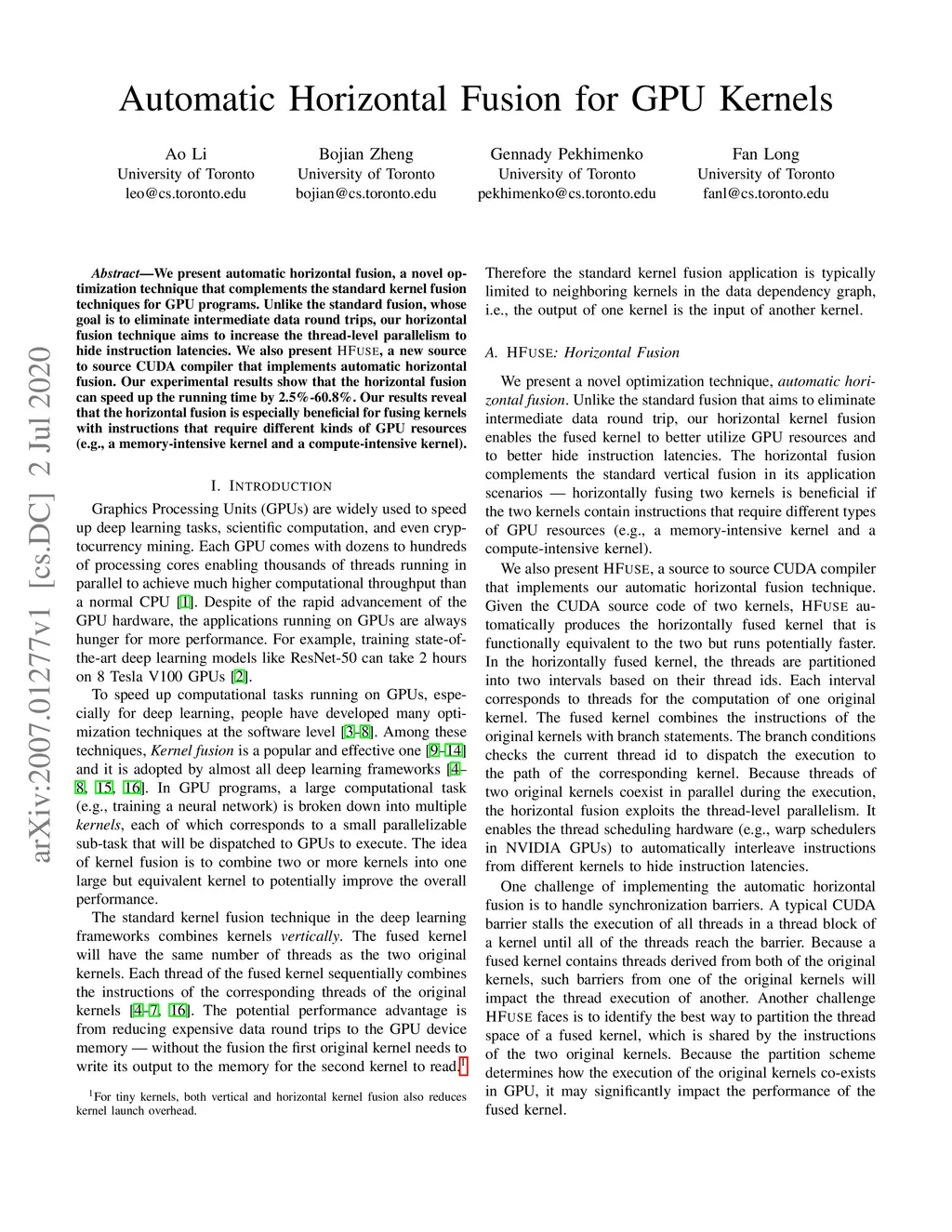 We present automatic horizontal fusion, a novel optimization technique that complements the standard kernel fusion techniques for GPU programs. Unlike the standard fusion, whose goal is to eliminate intermediate data round trips, our horizontal fusion technique aims to increase the thread-level parallelism to hide instruction latencies. We also present HFuse, a new source to source CUDA compiler that implements automatic horizontal fusion. Our experimental results show that horizontal fusion can speed up the running time by 2.5%-60.8%. Our results reveal that the horizontal fusion is especially beneficial for fusing kernels with instructions that require different kinds of GPU resources (e.g., a memory-intensive kernel and a compute-intensive kernel).