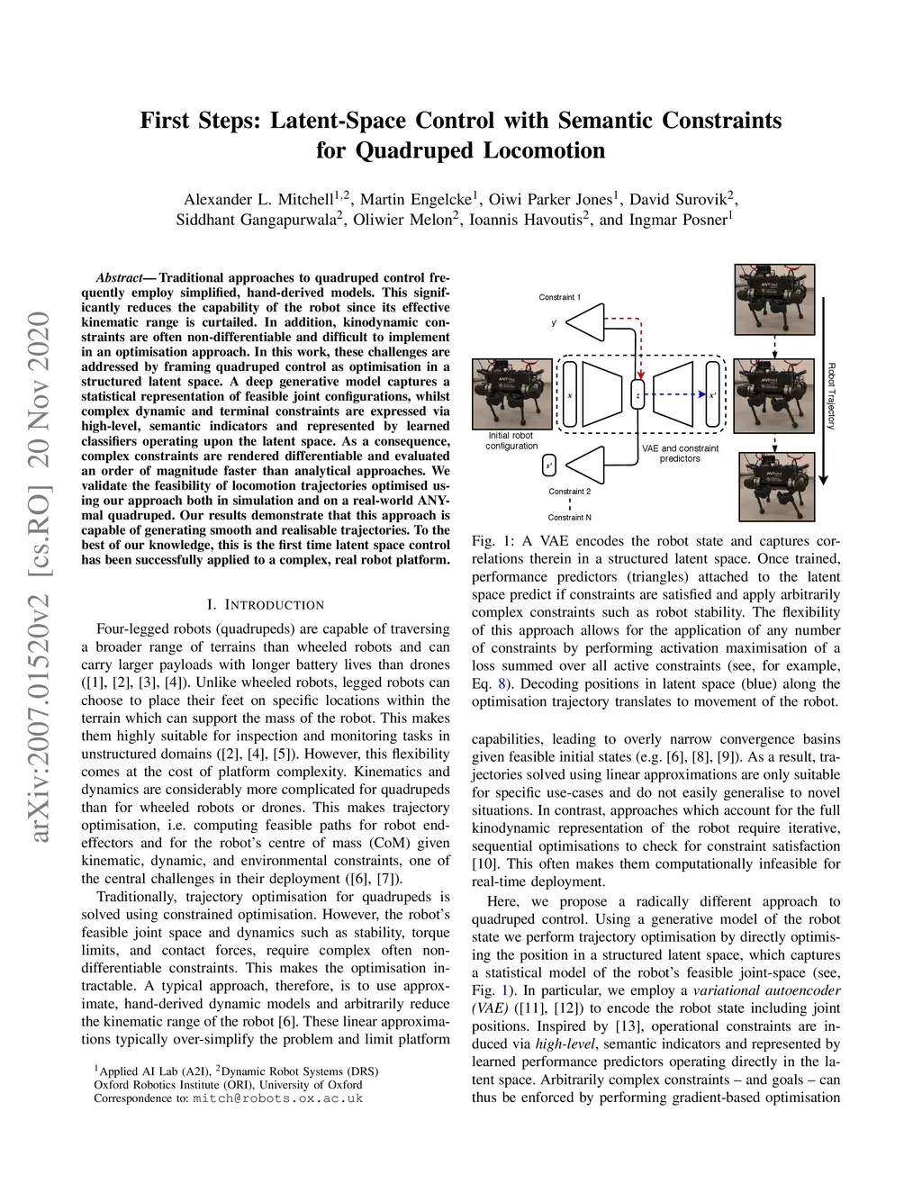 Traditional approaches to quadruped control frequently employ simplified, hand-derived models. This significantly reduces the capability of the robot since its effective kinematic range is curtailed. In addition, kinodynamic constraints are often non-differentiable and difficult to implement in an optimisation approach. In this work, these challenges are addressed by framing quadruped control as optimisation in a structured latent space. A deep generative model captures a statistical representation of feasible joint configurations, whilst complex dynamic and terminal constraints are expressed via high-level, semantic indicators and represented by learned classifiers operating upon the latent space. As a consequence, complex constraints are rendered differentiable and evaluated an order of magnitude faster than analytical approaches. We validate the feasibility of locomotion trajectories optimised using our approach both in simulation and on a real-world ANYmal quadruped. Our results demonstrate that this approach is capable of generating smooth and realisable trajectories. To the best of our knowledge, this is the first time latent space control has been successfully applied to a complex, real robot platform.