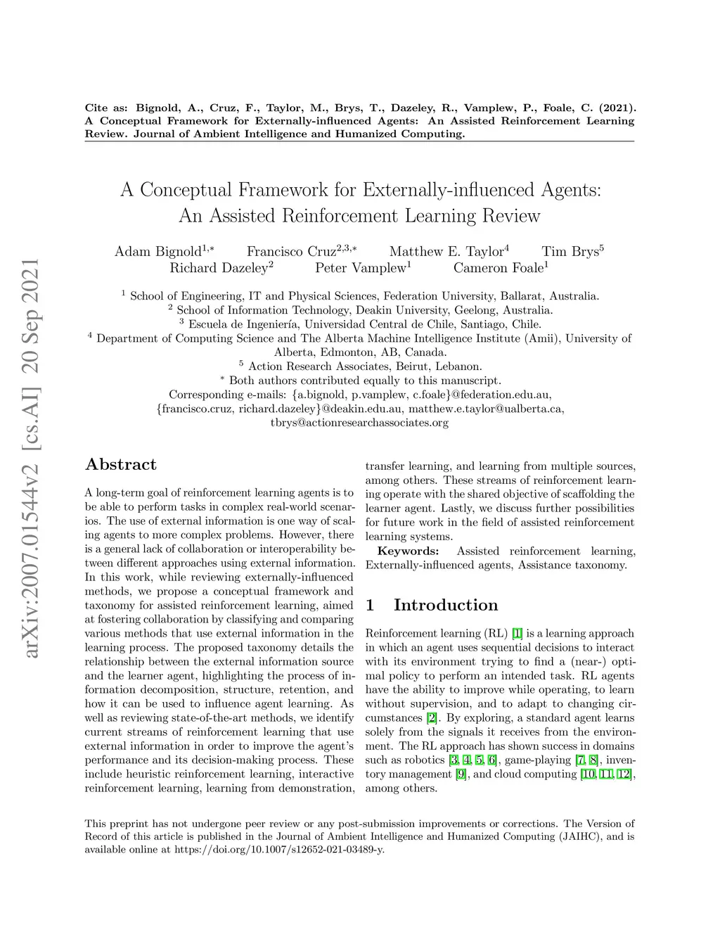 A long-term goal of reinforcement learning agents is to be able to perform tasks in complex real-world scenarios. The use of external information is one way of scaling agents to more complex problems. However, there is a general lack of collaboration or interoperability between different approaches using external information. In this work, while reviewing externally-influenced methods, we propose a conceptual framework and taxonomy for assisted reinforcement learning, aimed at fostering collaboration by classifying and comparing various methods that use external information in the learning process. The proposed taxonomy details the relationship between the external information source and the learner agent, highlighting the process of information decomposition, structure, retention, and how it can be used to influence agent learning. As well as reviewing state-of-the-art methods, we identify current streams of reinforcement learning that use external information in order to improve the agent's performance and its decision-making process. These include heuristic reinforcement learning, interactive reinforcement learning, learning from demonstration, transfer learning, and learning from multiple sources, among others. These streams of reinforcement learning operate with the shared objective of scaffolding the learner agent. Lastly, we discuss further possibilities for future work in the field of assisted reinforcement learning systems.