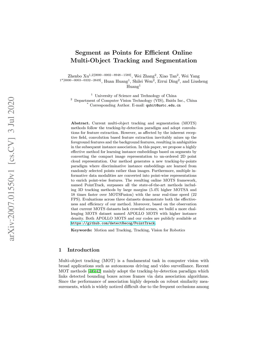 Current multi-object tracking and segmentation (MOTS) methods follow the tracking-by-detection paradigm and adopt convolutions for feature extraction. However, as affected by the inherent receptive field, convolution based feature extraction inevitably mixes up the foreground features and the background features, resulting in ambiguities in the subsequent instance association. In this paper, we propose a highly effective method for learning instance embeddings based on segments by converting the compact image representation to un-ordered 2D point cloud representation. Our method generates a new tracking-by-points paradigm where discriminative instance embeddings are learned from randomly selected points rather than images. Furthermore, multiple informative data modalities are converted into point-wise representations to enrich point-wise features. The resulting online MOTS framework, named PointTrack, surpasses all the state-of-the-art methods including 3D tracking methods by large margins (5.4% higher MOTSA and 18 times faster over MOTSFusion) with the near real-time speed (22 FPS). Evaluations across three datasets demonstrate both the effectiveness and efficiency of our method. Moreover, based on the observation that current MOTS datasets lack crowded scenes, we build a more challenging MOTS dataset named APOLLO MOTS with higher instance density. Both APOLLO MOTS and our codes are publicly available at https://github.com/detectRecog/PointTrack.