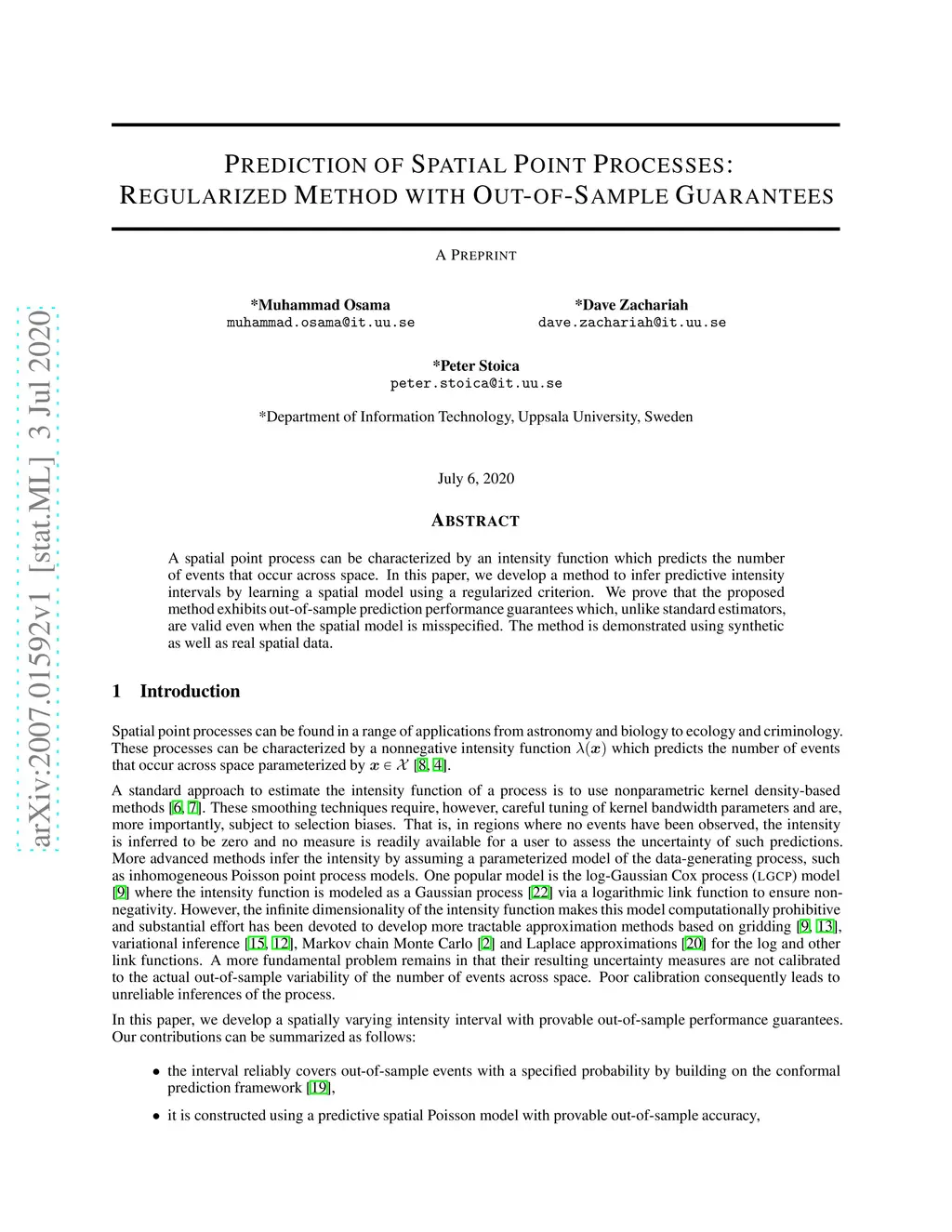 A spatial point process can be characterized by an intensity function which predicts the number of events that occur across space. In this paper, we develop a method to infer predictive intensity intervals by learning a spatial model using a regularized criterion. We prove that the proposed method exhibits out-of-sample prediction performance guarantees which, unlike standard estimators, are valid even when the spatial model is misspecified. The method is demonstrated using synthetic as well as real spatial data.