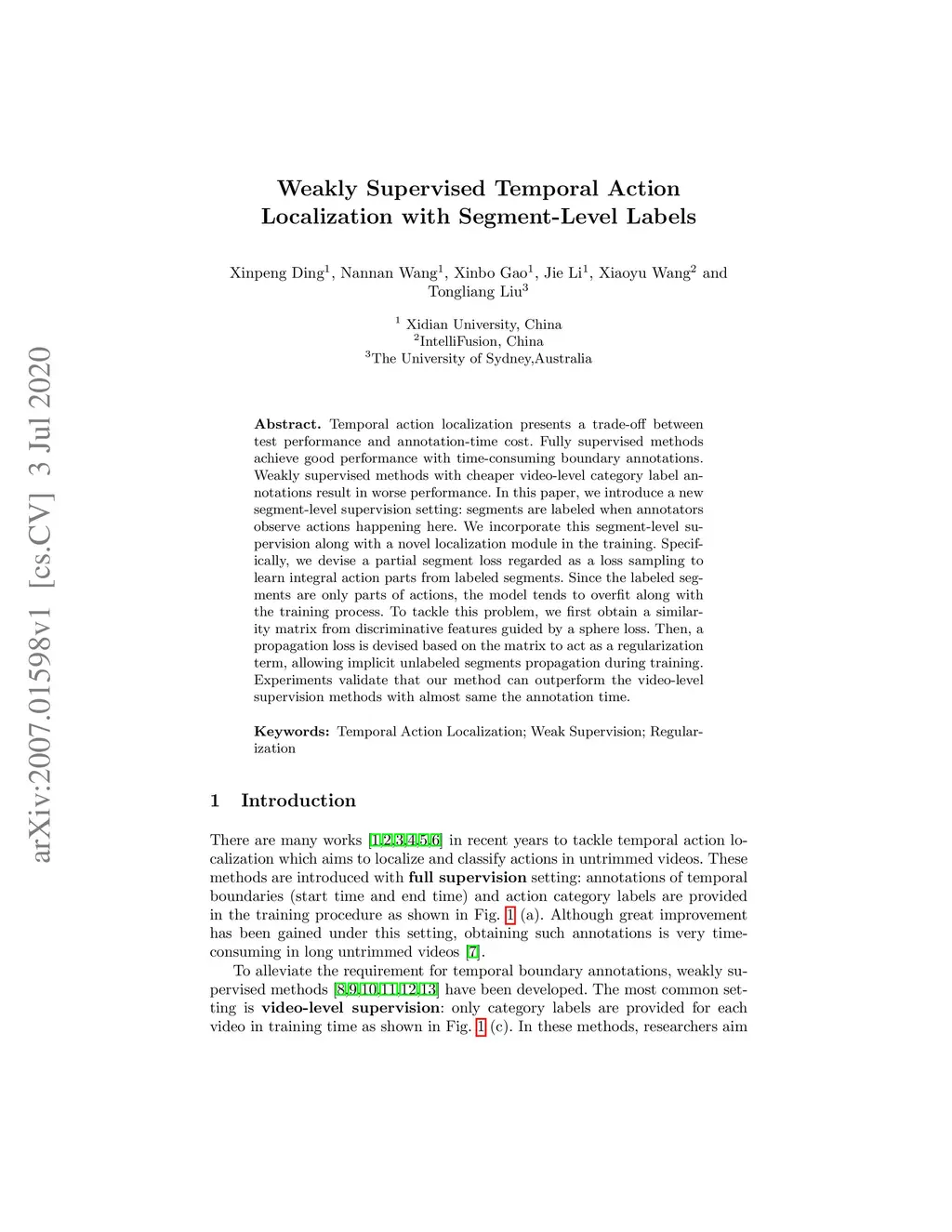 Temporal action localization presents a trade-off between test performance and annotation-time cost. Fully supervised methods achieve good performance with time-consuming boundary annotations. Weakly supervised methods with cheaper video-level category label annotations result in worse performance. In this paper, we introduce a new segment-level supervision setting: segments are labeled when annotators observe actions happening here. We incorporate this segment-level supervision along with a novel localization module in the training. Specifically, we devise a partial segment loss regarded as a loss sampling to learn integral action parts from labeled segments. Since the labeled segments are only parts of actions, the model tends to overfit along with the training process. To tackle this problem, we first obtain a similarity matrix from discriminative features guided by a sphere loss. Then, a propagation loss is devised based on the matrix to act as a regularization term, allowing implicit unlabeled segments propagation during training. Experiments validate that our method can outperform the video-level supervision methods with almost same the annotation time.