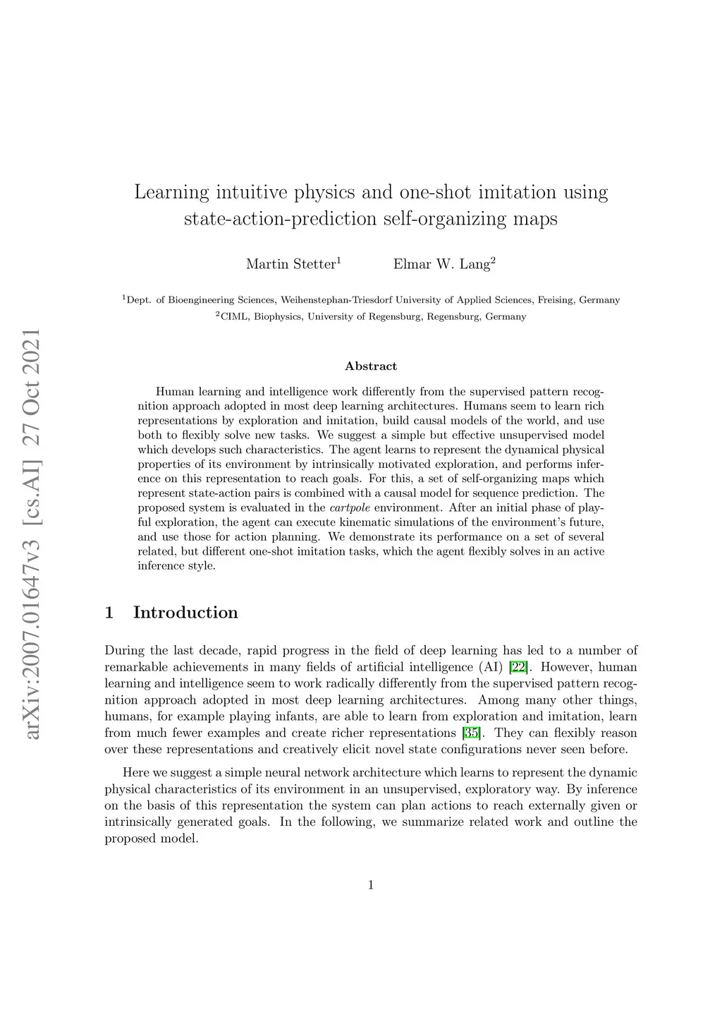 Learning intuitive physics and one-shot imitation using state-action-prediction self-organizing maps