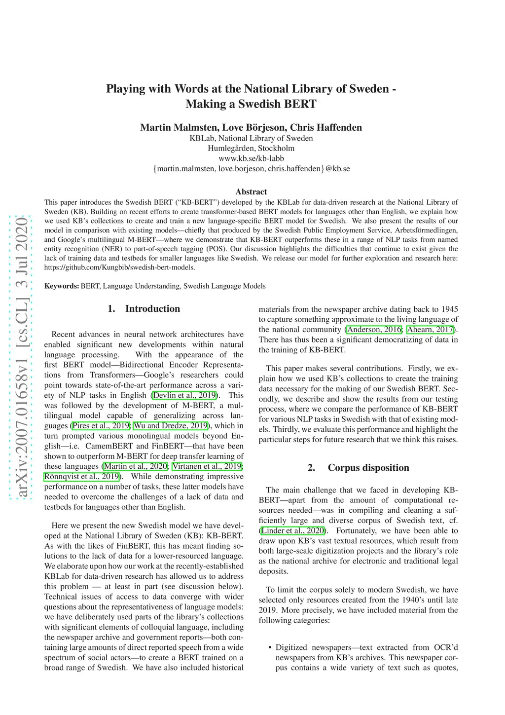 This paper introduces the Swedish BERT ("KB-BERT") developed by the KBLab for data-driven research at the National Library of Sweden (KB). Building on recent efforts to create transformer-based BERT models for languages other than English, we explain how we used KB's collections to create and train a new language-specific BERT model for Swedish. We also present the results of our model in comparison with existing models - chiefly that produced by the Swedish Public Employment Service, Arbetsf\"ormedlingen, and Google's multilingual M-BERT - where we demonstrate that KB-BERT outperforms these in a range of NLP tasks from named entity recognition (NER) to part-of-speech tagging (POS). Our discussion highlights the difficulties that continue to exist given the lack of training data and testbeds for smaller languages like Swedish. We release our model for further exploration and research here: https://github.com/Kungbib/swedish-bert-models .
