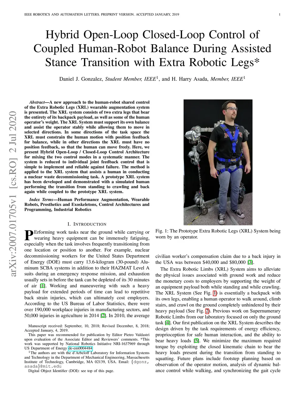 A new approach to the human-robot shared control of the Extra Robotic Legs (XRL) wearable augmentation system is presented. The XRL system consists of two extra legs that bear the entirety of its backpack payload, as well as some of the human operator's weight. The XRL System must support its own balance and assist the operator stably while allowing them to move in selected directions. In some directions of the task space the XRL must constrain the human motion with position feedback for balance, while in other directions the XRL must have no position feedback, so that the human can move freely. Here, we present Hybrid Open-Loop / Closed-Loop Control Architecture for mixing the two control modes in a systematic manner. The system is reduced to individual joint feedback control that is simple to implement and reliable against failure. The method is applied to the XRL system that assists a human in conducting a nuclear waste decommissioning task. A prototype XRL system has been developed and demonstrated with a simulated human performing the transition from standing to crawling and back again while coupled to the prototype XRL system.