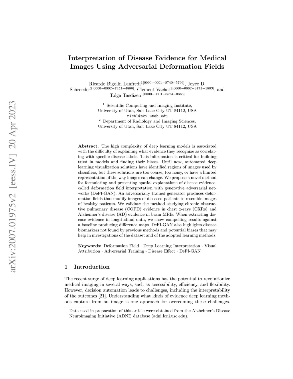 The high complexity of deep learning models is associated with the difficulty of explaining what evidence they recognize as correlating with specific disease labels. This information is critical for building trust in models and finding their biases. Until now, automated deep learning visualization solutions have identified regions of images used by classifiers, but these solutions are too coarse, too noisy, or have a limited representation of the way images can change. We propose a novel method for formulating and presenting spatial explanations of disease evidence, called deformation field interpretation with generative adversarial networks (DeFI-GAN). An adversarially trained generator produces deformation fields that modify images of diseased patients to resemble images of healthy patients. We validate the method studying chronic obstructive pulmonary disease (COPD) evidence in chest x-rays (CXRs) and Alzheimer's disease (AD) evidence in brain MRIs. When extracting disease evidence in longitudinal data, we show compelling results against a baseline producing difference maps. DeFI-GAN also highlights disease biomarkers not found by previous methods and potential biases that may help in investigations of the dataset and of the adopted learning methods.