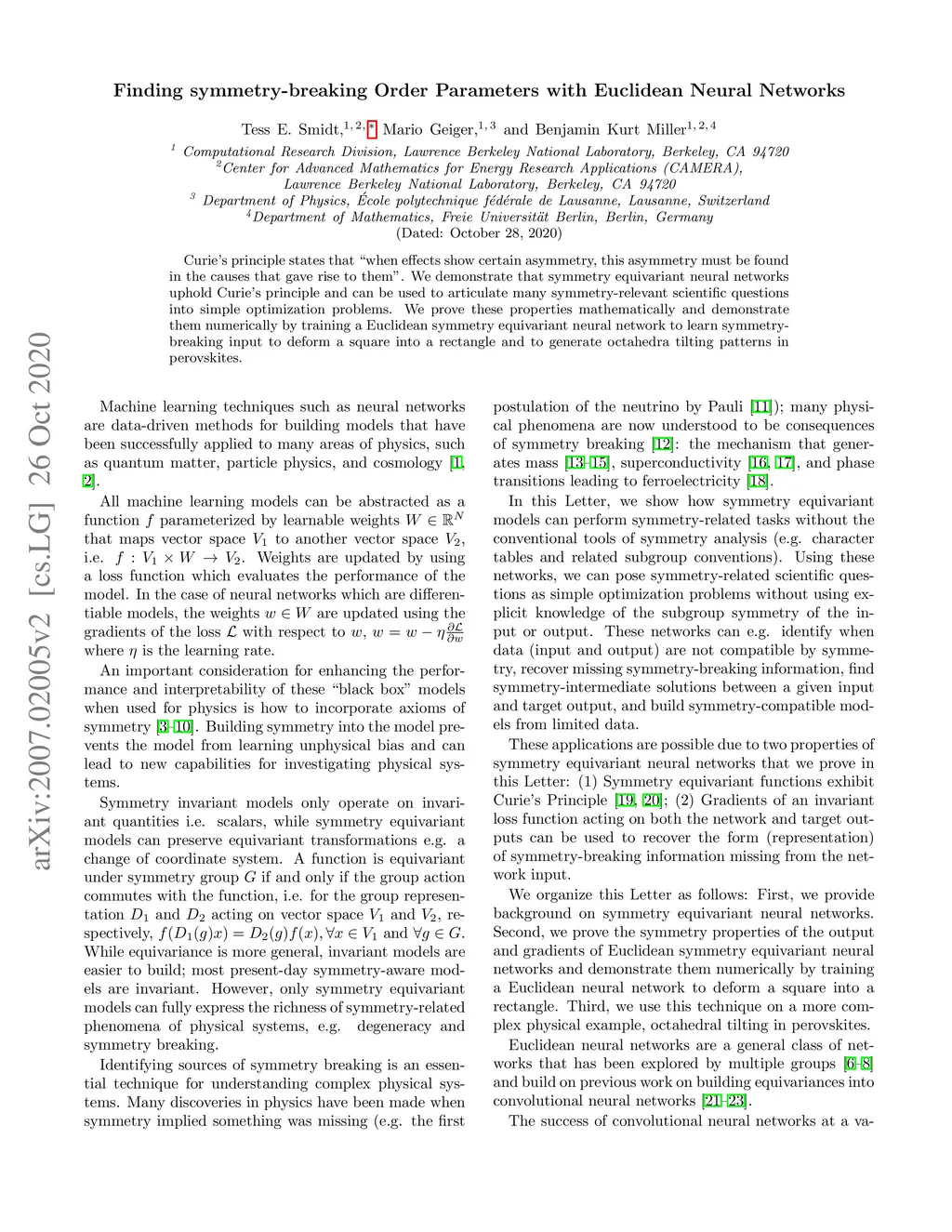 Curie's principle states that "when effects show certain asymmetry, this asymmetry must be found in the causes that gave rise to them". We demonstrate that symmetry equivariant neural networks uphold Curie's principle and can be used to articulate many symmetry-relevant scientific questions into simple optimization problems. We prove these properties mathematically and demonstrate them numerically by training a Euclidean symmetry equivariant neural network to learn symmetry-breaking input to deform a square into a rectangle and to generate octahedra tilting patterns in perovskites.