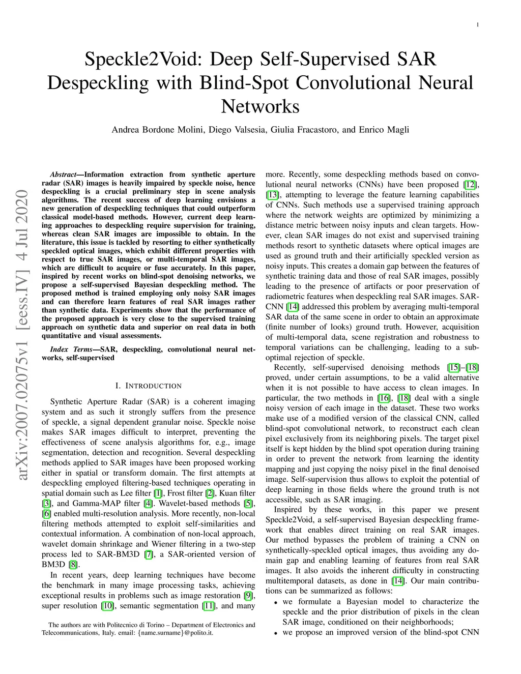 Speckle2Void: Deep Self-Supervised SAR Despeckling with Blind-Spot