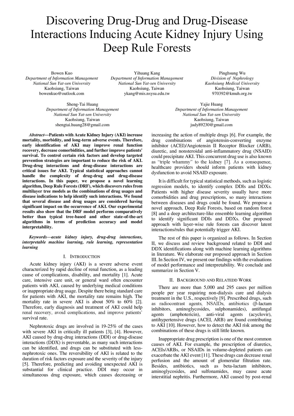 Patients with Acute Kidney Injury (AKI) increase mortality, morbidity, and long-term adverse events. Therefore, early identification of AKI may improve renal function recovery, decrease comorbidities, and further improve patients' survival. To control certain risk factors and develop targeted prevention strategies are important to reduce the risk of AKI. Drug-drug interactions and drug-disease interactions are critical issues for AKI. Typical statistical approaches cannot handle the complexity of drug-drug and drug-disease interactions. In this paper, we propose a novel learning algorithm, Deep Rule Forests (DRF), which discovers rules from multilayer tree models as the combinations of drug usages and disease indications to help identify such interactions. We found that several disease and drug usages are considered having significant impact on the occurrence of AKI. Our experimental results also show that the DRF model performs comparatively better than typical tree-based and other state-of-the-art algorithms in terms of prediction accuracy and model interpretability.