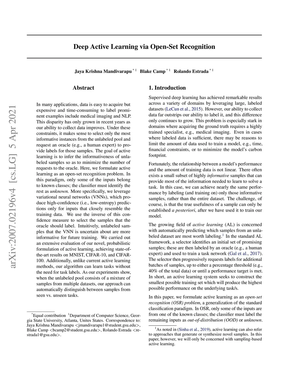 In many applications, data is easy to acquire but expensive and time-consuming to label prominent examples include medical imaging and NLP. This disparity has only grown in recent years as our ability to collect data improves. Under these constraints, it makes sense to select only the most informative instances from the unlabeled pool and request an oracle (e.g., a human expert) to provide labels for those samples. The goal of active learning is to infer the informativeness of unlabeled samples so as to minimize the number of requests to the oracle. Here, we formulate active learning as an open-set recognition problem. In this paradigm, only some of the inputs belong to known classes; the classifier must identify the rest as unknown. More specifically, we leverage variational neural networks (VNNs), which produce high-confidence (i.e., low-entropy) predictions only for inputs that closely resemble the training data. We use the inverse of this confidence measure to select the samples that the oracle should label. Intuitively, unlabeled samples that the VNN is uncertain about are more informative for future training. We carried out an extensive evaluation of our novel, probabilistic formulation of active learning, achieving state-of-the-art results on MNIST, CIFAR-10, and CIFAR-100. Additionally, unlike current active learning methods, our algorithm can learn tasks without the need for task labels. As our experiments show, when the unlabeled pool consists of a mixture of samples from multiple datasets, our approach can automatically distinguish between samples from seen vs. unseen tasks.