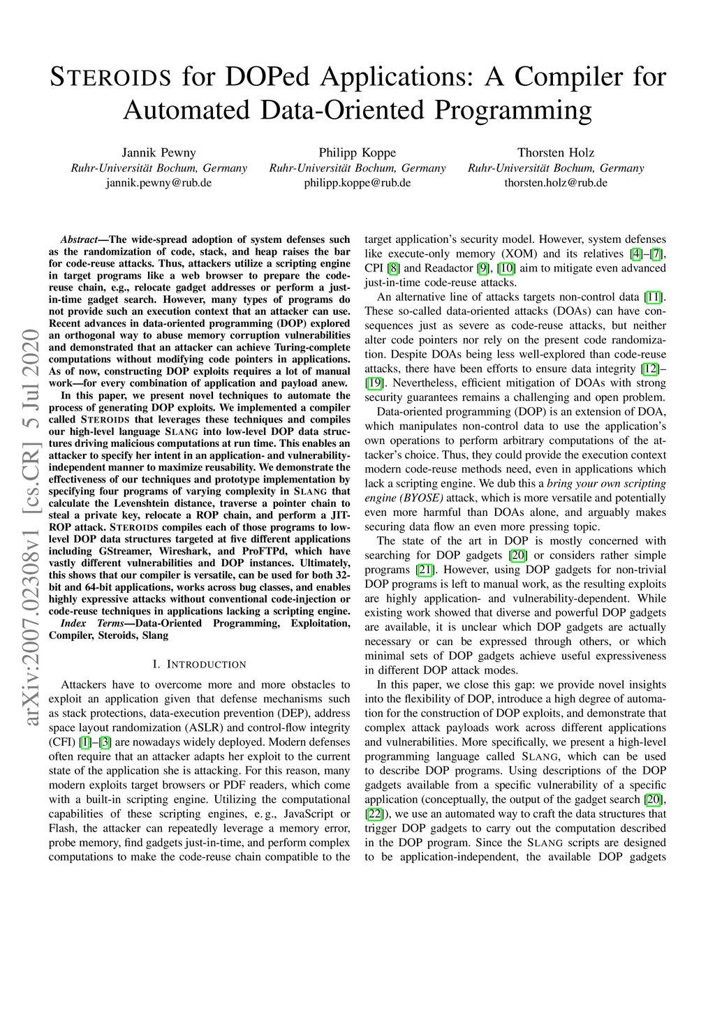 The wide-spread adoption of system defenses such as the randomization of code, stack, and heap raises the bar for code-reuse attacks. Thus, attackers utilize a scripting engine in target programs like a web browser to prepare the code-reuse chain, e.g., relocate gadget addresses or perform a just-in-time gadget search. However, many types of programs do not provide such an execution context that an attacker can use. Recent advances in data-oriented programming (DOP) explored an orthogonal way to abuse memory corruption vulnerabilities and demonstrated that an attacker can achieve Turing-complete computations without modifying code pointers in applications. As of now, constructing DOP exploits requires a lot of manual work. In this paper, we present novel techniques to automate the process of generating DOP exploits. We implemented a compiler called Steroids that compiles our high-level language SLANG into low-level DOP data structures driving malicious computations at run time. This enables an attacker to specify her intent in an application- and vulnerability-independent manner to maximize reusability. We demonstrate the effectiveness of our techniques and prototype implementation by specifying four programs of varying complexity in SLANG that calculate the Levenshtein distance, traverse a pointer chain to steal a private key, relocate a ROP chain, and perform a JIT-ROP attack. Steroids compiles each of those programs to low-level DOP data structures targeted at five different applications including GStreamer, Wireshark, and ProFTPd, which have vastly different vulnerabilities and DOP instances. Ultimately, this shows that our compiler is versatile, can be used for both 32- and 64-bit applications, works across bug classes, and enables highly expressive attacks without conventional code-injection or code-reuse techniques in applications lacking a scripting engine.