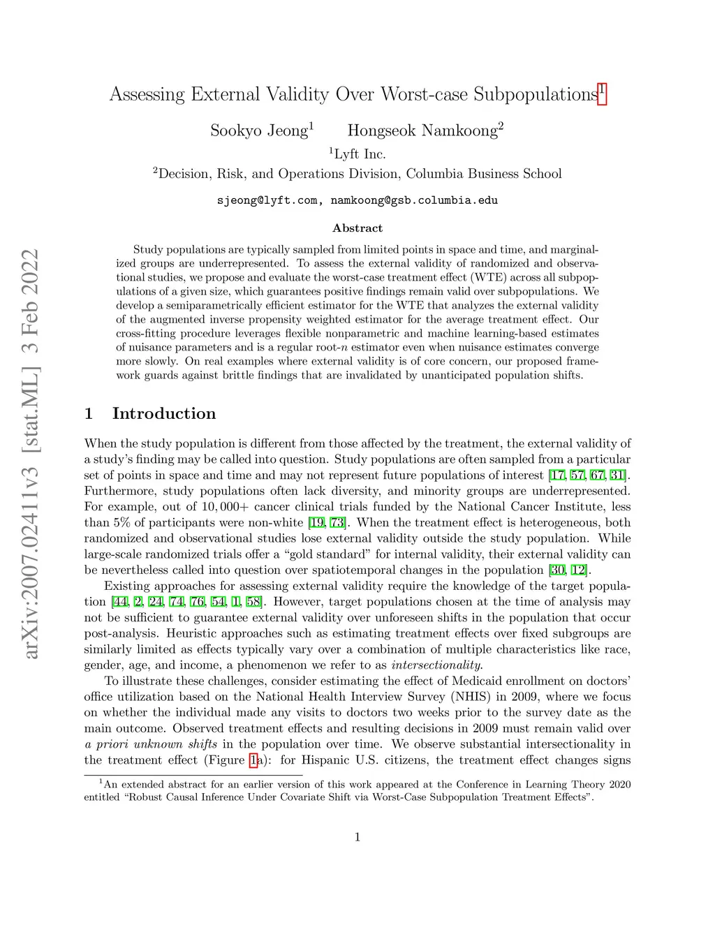 Study populations are typically sampled from limited points in space and time, and marginalized groups are underrepresented. To assess the external validity of randomized and observational studies, we propose and evaluate the worst-case treatment effect (WTE) across all subpopulations of a given size, which guarantees positive findings remain valid over subpopulations. We develop a semiparametrically efficient estimator for the WTE that analyzes the external validity of the augmented inverse propensity weighted estimator for the average treatment effect. Our cross-fitting procedure leverages flexible nonparametric and machine learning-based estimates of nuisance parameters and is a regular root- estimator even when nuisance estimates converge more slowly. On real examples where external validity is of core concern, our proposed framework guards against brittle findings that are invalidated by unanticipated population shifts.