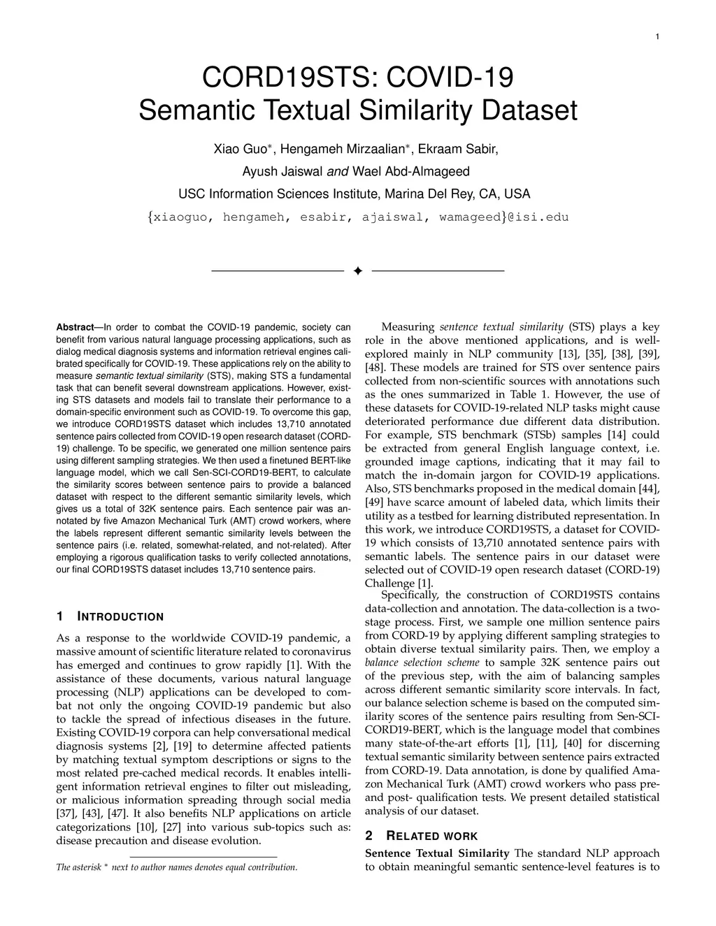 In order to combat the COVID-19 pandemic, society can benefit from various natural language processing applications, such as dialog medical diagnosis systems and information retrieval engines calibrated specifically for COVID-19. These applications rely on the ability to measure semantic textual similarity (STS), making STS a fundamental task that can benefit several downstream applications. However, existing STS datasets and models fail to translate their performance to a domain-specific environment such as COVID-19. To overcome this gap, we introduce CORD19STS dataset which includes 13,710 annotated sentence pairs collected from COVID-19 open research dataset (CORD-19) challenge. To be specific, we generated one million sentence pairs using different sampling strategies. We then used a finetuned BERT-like language model, which we call Sen-SCI-CORD19-BERT, to calculate the similarity scores between sentence pairs to provide a balanced dataset with respect to the different semantic similarity levels, which gives us a total of 32K sentence pairs. Each sentence pair was annotated by five Amazon Mechanical Turk (AMT) crowd workers, where the labels represent different semantic similarity levels between the sentence pairs (i.e. related, somewhat-related, and not-related). After employing a rigorous qualification tasks to verify collected annotations, our final CORD19STS dataset includes 13,710 sentence pairs.