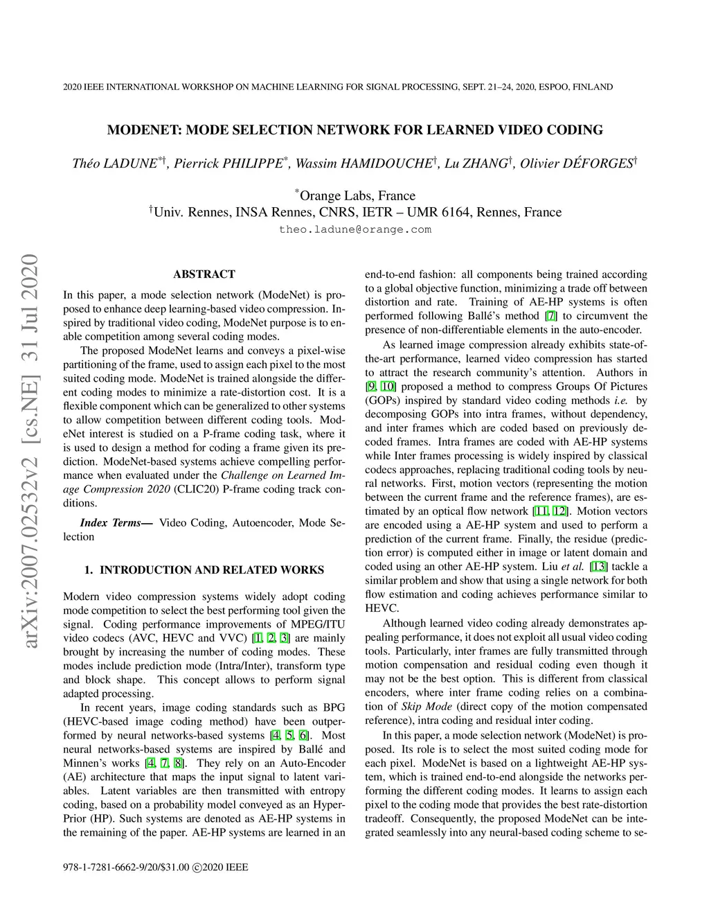 In this paper, a mode selection network (ModeNet) is proposed to enhance deep learning-based video compression. Inspired by traditional video coding, ModeNet purpose is to enable competition among several coding modes. The proposed ModeNet learns and conveys a pixel-wise partitioning of the frame, used to assign each pixel to the most suited coding mode. ModeNet is trained alongside the different coding modes to minimize a rate-distortion cost. It is a flexible component which can be generalized to other systems to allow competition between different coding tools. Mod-eNet interest is studied on a P-frame coding task, where it is used to design a method for coding a frame given its prediction. ModeNet-based systems achieve compelling performance when evaluated under the Challenge on Learned Image Compression 2020 (CLIC20) P-frame coding track conditions.