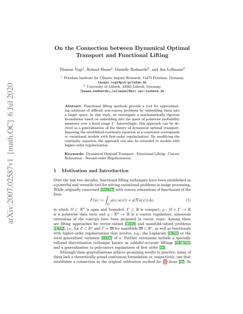 Functional lifting methods provide a tool for approximating solutions of difficult non-convex problems by embedding them into a larger space. In this work, we investigate a mathematically rigorous formulation based on embedding into the space of pointwise probability measures over a fixed range . Interestingly, this approach can be derived as a generalization of the theory of dynamical optimal transport. Imposing the established continuity equation as a constraint corresponds to variational models with first-order regularization. By modifying the continuity equation, the approach can also be extended to models with higher-order regularization.