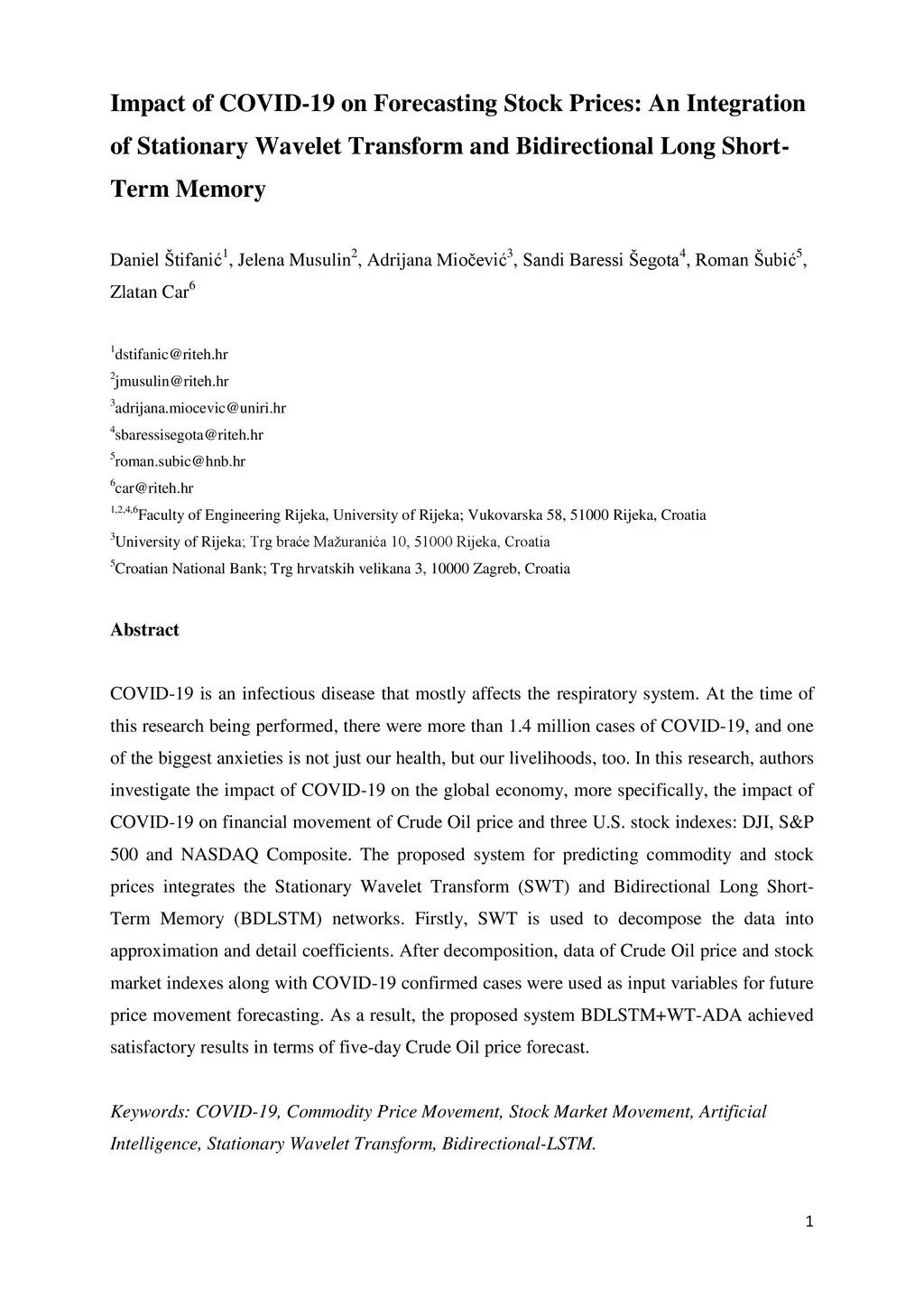 COVID-19 is an infectious disease that mostly affects the respiratory system. At the time of this research being performed, there were more than 1.4 million cases of COVID-19, and one of the biggest anxieties is not just our health, but our livelihoods, too. In this research, authors investigate the impact of COVID-19 on the global economy, more specifically, the impact of COVID-19 on financial movement of Crude Oil price and three U.S. stock indexes: DJI, S&P 500 and NASDAQ Composite. The proposed system for predicting commodity and stock prices integrates the Stationary Wavelet Transform (SWT) and Bidirectional Long Short-Term Memory (BDLSTM) networks. Firstly, SWT is used to decompose the data into approximation and detail coefficients. After decomposition, data of Crude Oil price and stock market indexes along with COVID-19 confirmed cases were used as input variables for future price movement forecasting. As a result, the proposed system BDLSTM+WT-ADA achieved satisfactory results in terms of five-day Crude Oil price forecast.