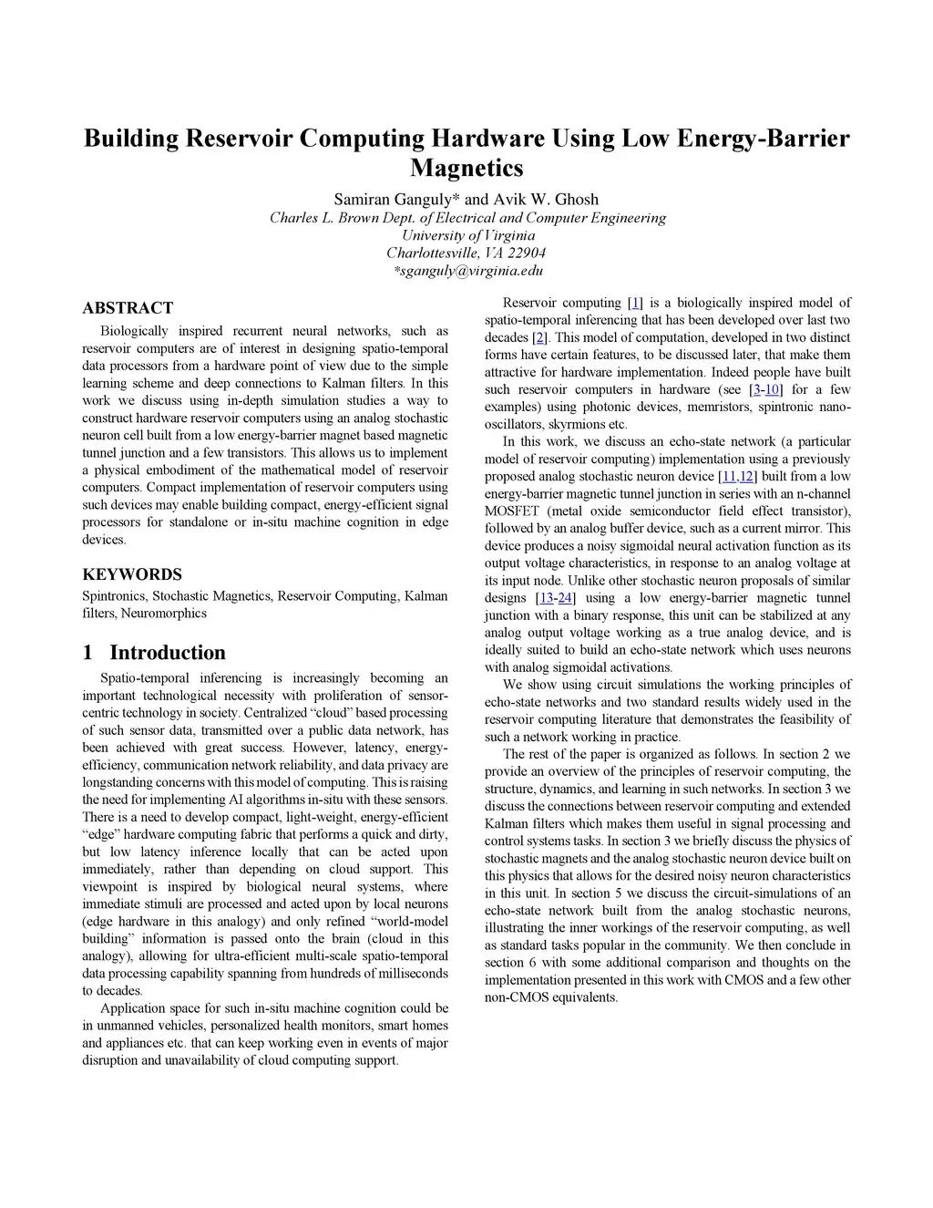 Biologically inspired recurrent neural networks, such as reservoir computers are of interest in designing spatio-temporal data processors from a hardware point of view due to the simple learning scheme and deep connections to Kalman filters. In this work we discuss using in-depth simulation studies a way to construct hardware reservoir computers using an analog stochastic neuron cell built from a low energy-barrier magnet based magnetic tunnel junction and a few transistors. This allows us to implement a physical embodiment of the mathematical model of reservoir computers. Compact implementation of reservoir computers using such devices may enable building compact, energy-efficient signal processors for standalone or in-situ machine cognition in edge devices.