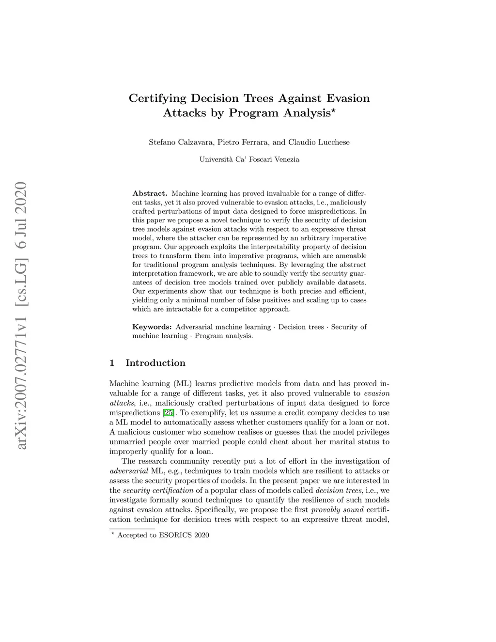 Machine learning has proved invaluable for a range of different tasks, yet it also proved vulnerable to evasion attacks, i.e., maliciously crafted perturbations of input data designed to force mispredictions. In this paper we propose a novel technique to verify the security of decision tree models against evasion attacks with respect to an expressive threat model, where the attacker can be represented by an arbitrary imperative program. Our approach exploits the interpretability property of decision trees to transform them into imperative programs, which are amenable for traditional program analysis techniques. By leveraging the abstract interpretation framework, we are able to soundly verify the security guarantees of decision tree models trained over publicly available datasets. Our experiments show that our technique is both precise and efficient, yielding only a minimal number of false positives and scaling up to cases which are intractable for a competitor approach.