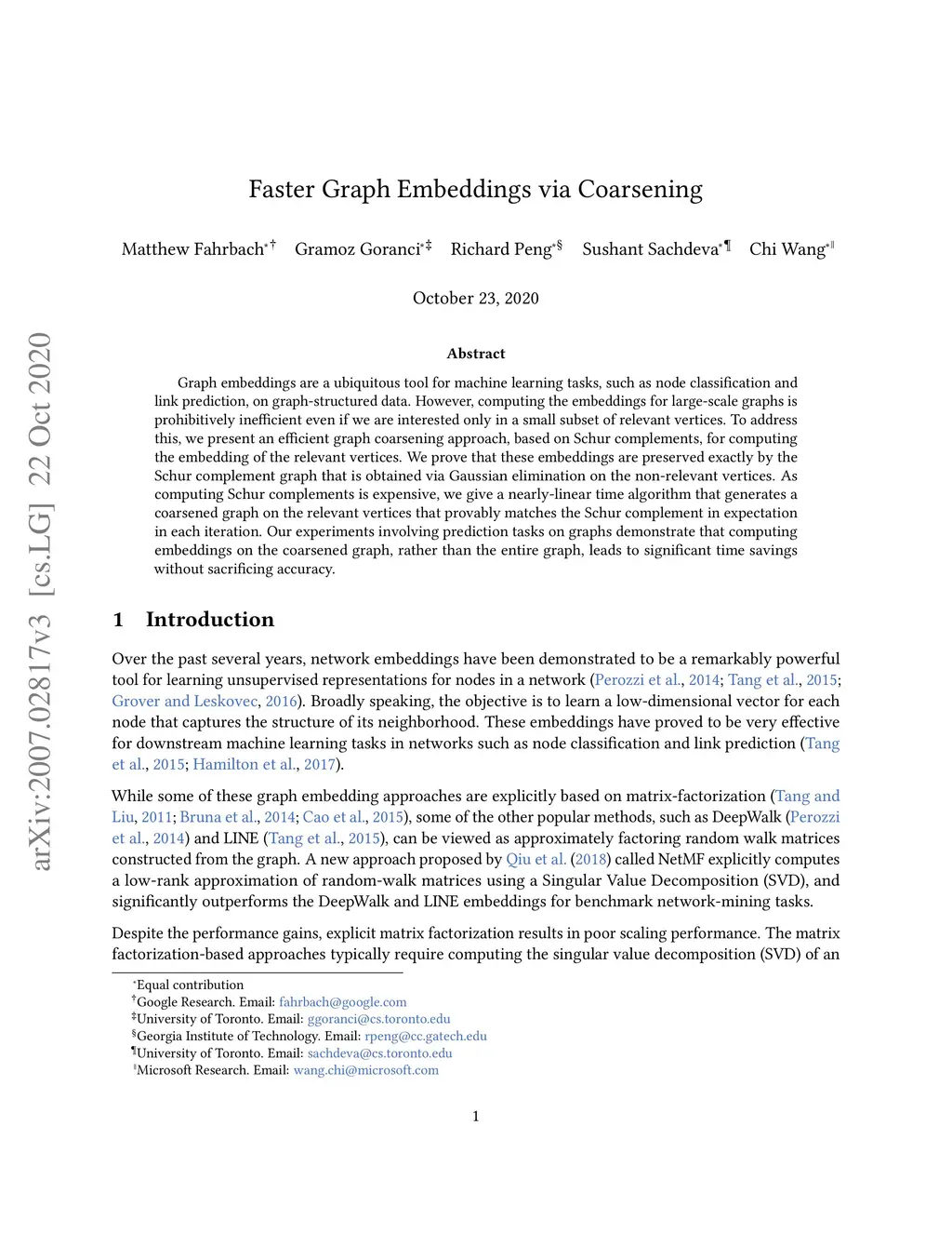 Graph embeddings are a ubiquitous tool for machine learning tasks, such as node classification and link prediction, on graph-structured data. However, computing the embeddings for large-scale graphs is prohibitively inefficient even if we are interested only in a small subset of relevant vertices. To address this, we present an efficient graph coarsening approach, based on Schur complements, for computing the embedding of the relevant vertices. We prove that these embeddings are preserved exactly by the Schur complement graph that is obtained via Gaussian elimination on the non-relevant vertices. As computing Schur complements is expensive, we give a nearly-linear time algorithm that generates a coarsened graph on the relevant vertices that provably matches the Schur complement in expectation in each iteration. Our experiments involving prediction tasks on graphs demonstrate that computing embeddings on the coarsened graph, rather than the entire graph, leads to significant time savings without sacrificing accuracy.