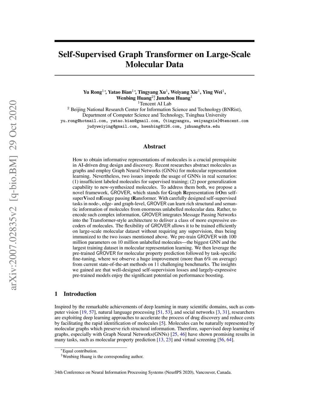 How to obtain informative representations of molecules is a crucial prerequisite in AI-driven drug design and discovery. Recent researches abstract molecules as graphs and employ Graph Neural Networks (GNNs) for molecular representation learning. Nevertheless, two issues impede the usage of GNNs in real scenarios: (1) insufficient labeled molecules for supervised training; (2) poor generalization capability to new-synthesized molecules. To address them both, we propose a novel framework, GROVER, which stands for Graph Representation frOm self-superVised mEssage passing tRansformer. With carefully designed self-supervised tasks in node-, edge- and graph-level, GROVER can learn rich structural and semantic information of molecules from enormous unlabelled molecular data. Rather, to encode such complex information, GROVER integrates Message Passing Networks into the Transformer-style architecture to deliver a class of more expressive encoders of molecules. The flexibility of GROVER allows it to be trained efficiently on large-scale molecular dataset without requiring any supervision, thus being immunized to the two issues mentioned above. We pre-train GROVER with 100 million parameters on 10 million unlabelled molecules -- the biggest GNN and the largest training dataset in molecular representation learning. We then leverage the pre-trained GROVER for molecular property prediction followed by task-specific fine-tuning, where we observe a huge improvement (more than 6% on average) from current state-of-the-art methods on 11 challenging benchmarks. The insights we gained are that well-designed self-supervision losses and largely-expressive pre-trained models enjoy the significant potential on performance boosting.