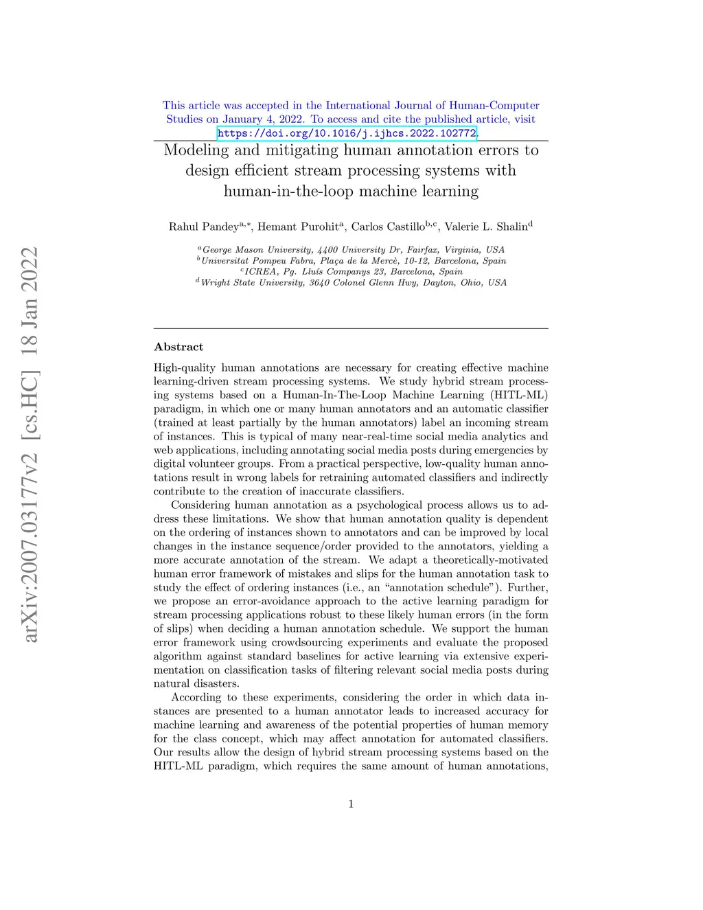 High-quality human annotations are necessary for creating effective machine learning-driven stream processing systems. We study hybrid stream processing systems based on a Human-In-The-Loop Machine Learning (HITL-ML) paradigm, in which one or many human annotators and an automatic classifier (trained at least partially by the human annotators) label an incoming stream of instances. This is typical of many near-real-time social media analytics and web applications, including annotating social media posts during emergencies by digital volunteer groups. From a practical perspective, low-quality human annotations result in wrong labels for retraining automated classifiers and indirectly contribute to the creation of inaccurate classifiers. Considering human annotation as a psychological process allows us to address these limitations. We show that human annotation quality is dependent on the ordering of instances shown to annotators and can be improved by local changes in the instance sequence/order provided to the annotators, yielding a more accurate annotation of the stream. We adapt a theoretically-motivated human error framework of mistakes and slips for the human annotation task to study the effect of ordering instances (i.e., an "annotation schedule"). Further, we propose an error-avoidance approach to the active learning paradigm for stream processing applications robust to these likely human errors (in the form of slips) when deciding a human annotation schedule. We support the human error framework using crowdsourcing experiments and evaluate the proposed algorithm against standard baselines for active learning via extensive experimentation on classification tasks of filtering relevant social media posts during natural disasters.