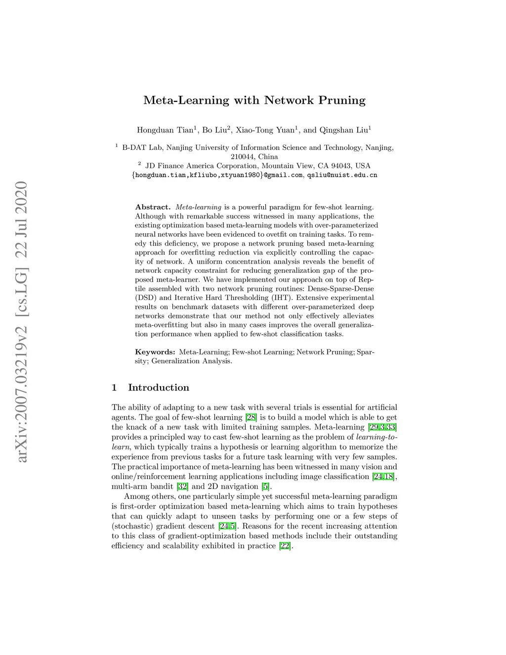 Meta-learning is a powerful paradigm for few-shot learning. Although with remarkable success witnessed in many applications, the existing optimization based meta-learning models with over-parameterized neural networks have been evidenced to ovetfit on training tasks. To remedy this deficiency, we propose a network pruning based meta-learning approach for overfitting reduction via explicitly controlling the capacity of network. A uniform concentration analysis reveals the benefit of network capacity constraint for reducing generalization gap of the proposed meta-learner. We have implemented our approach on top of Reptile assembled with two network pruning routines: Dense-Sparse-Dense (DSD) and Iterative Hard Thresholding (IHT). Extensive experimental results on benchmark datasets with different over-parameterized deep networks demonstrate that our method not only effectively alleviates meta-overfitting but also in many cases improves the overall generalization performance when applied to few-shot classification tasks.