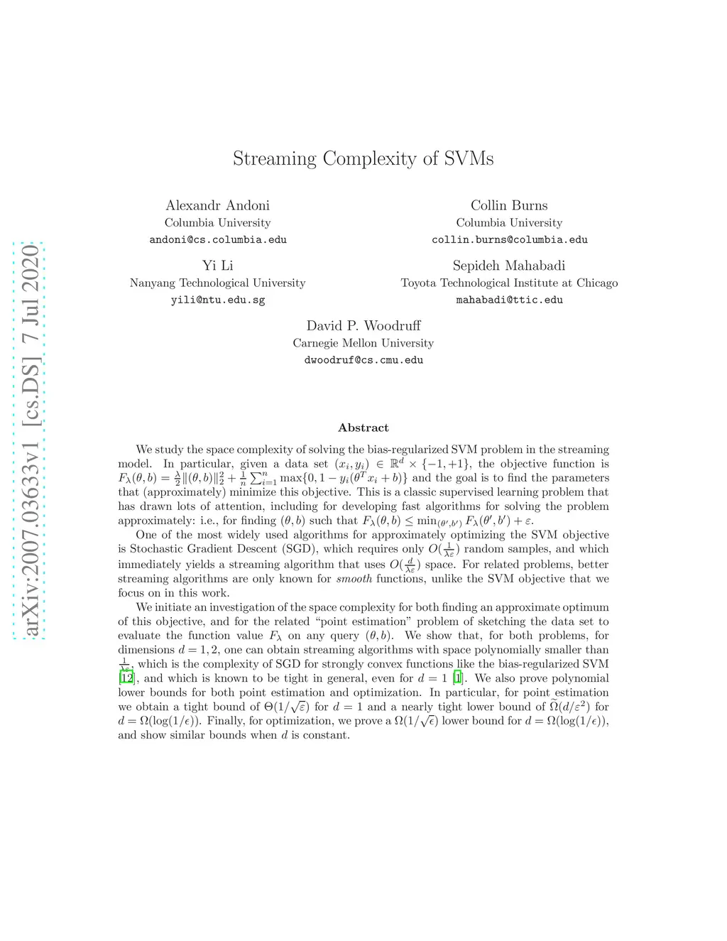 We study the space complexity of solving the bias-regularized SVM problem in the streaming model. This is a classic supervised learning problem that has drawn lots of attention, including for developing fast algorithms for solving the problem approximately. One of the most widely used algorithms for approximately optimizing the SVM objective is Stochastic Gradient Descent (SGD), which requires only random samples, and which immediately yields a streaming algorithm that uses space. For related problems, better streaming algorithms are only known for smooth functions, unlike the SVM objective that we focus on in this work. We initiate an investigation of the space complexity for both finding an approximate optimum of this objective, and for the related ``point estimation'' problem of sketching the data set to evaluate the function value on any query . We show that, for both problems, for dimensions , one can obtain streaming algorithms with space polynomially smaller than , which is the complexity of SGD for strongly convex functions like the bias-regularized SVM, and which is known to be tight in general, even for . We also prove polynomial lower bounds for both point estimation and optimization. In particular, for point estimation we obtain a tight bound of for and a nearly tight lower bound of for . Finally, for optimization, we prove a lower bound for , and show similar bounds when is constant.